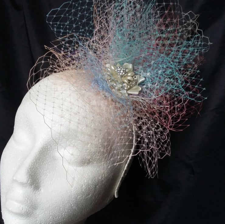 Created many pieces of pastel coloured classic Russian veiling, gathered and sewn together, coloured include- pale pink, pale blue, pale turquoise, coral, lilac, nude, ivory merry widow & pearls, peach and pale green.
