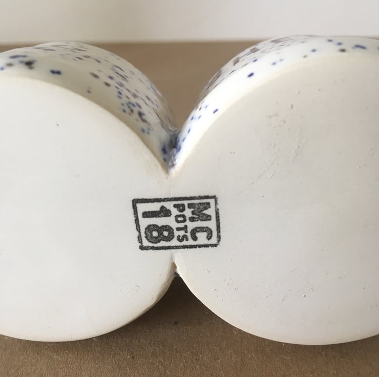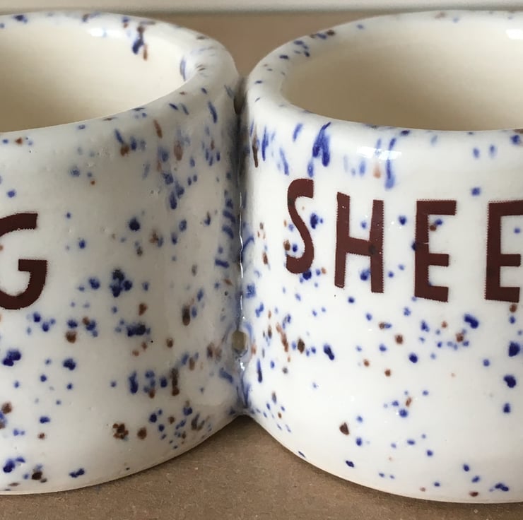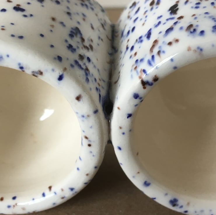 Double egg cup. Made on my pottery wheel using a white earthenware clay. This speckled fella has a cheeky tribute to a great singer, song writer and musician. The glaze is a speckled blue, satin finish.