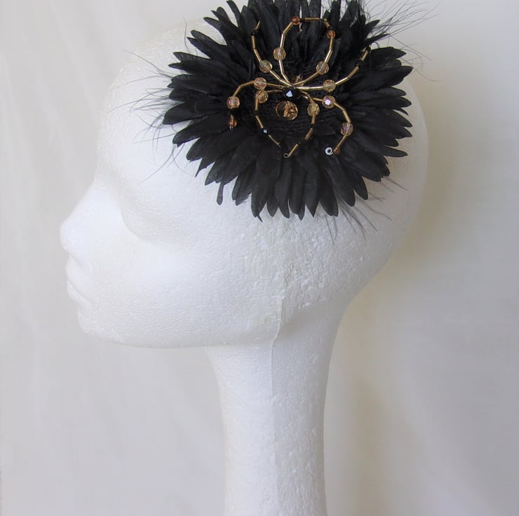 This is a cute and unusual black and gold flower hair clip fascinator accessory.