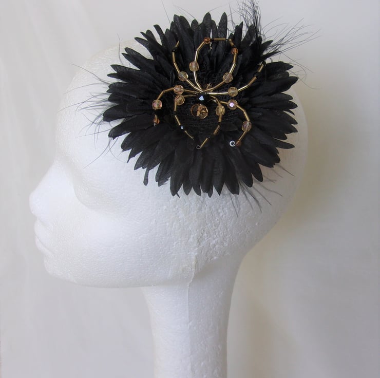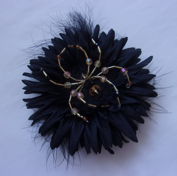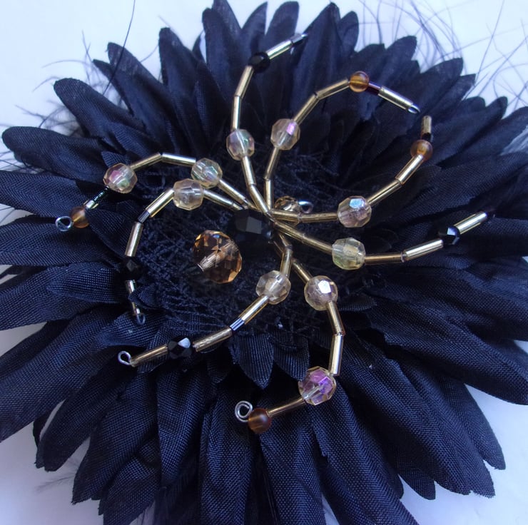 Created with a black fabric gerbera daisy flower, with some fluff feathers between the layers and finished with a stunning handcrafted gold & black beaded spider mounted on felt and abaca ribbon, made with various beads and bugle beads.