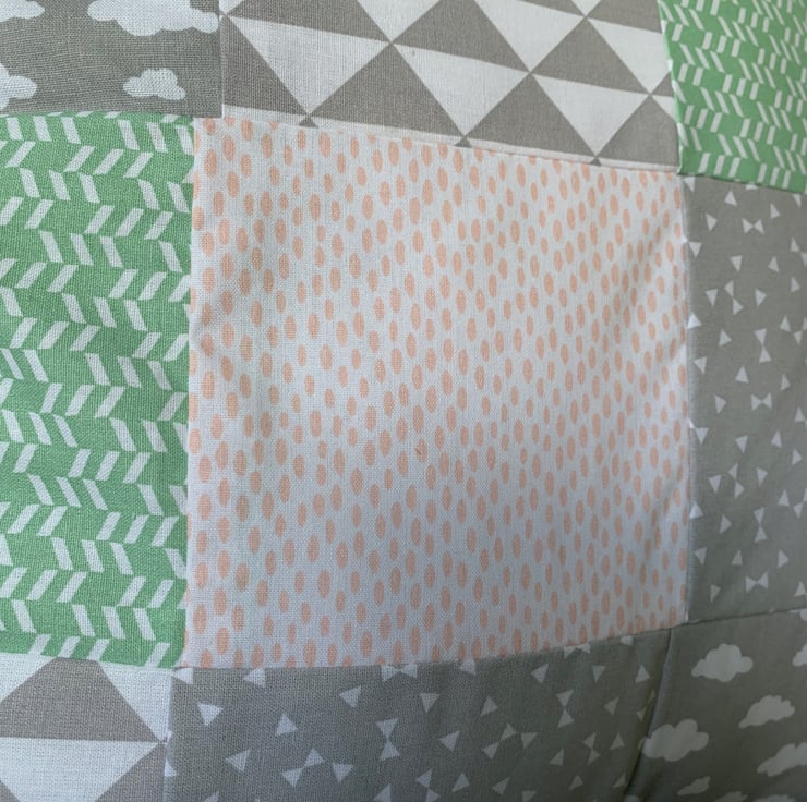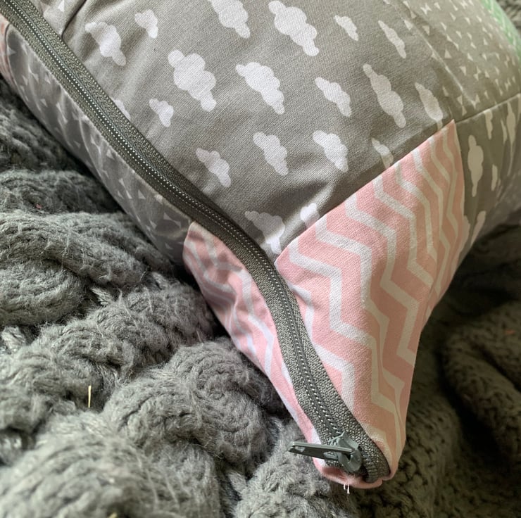 Grey, pink and green patterned 100% cotton fabric cushion with patchwork effect. Comes with inside cushion and zip at bottom.