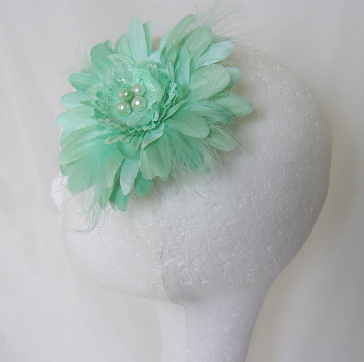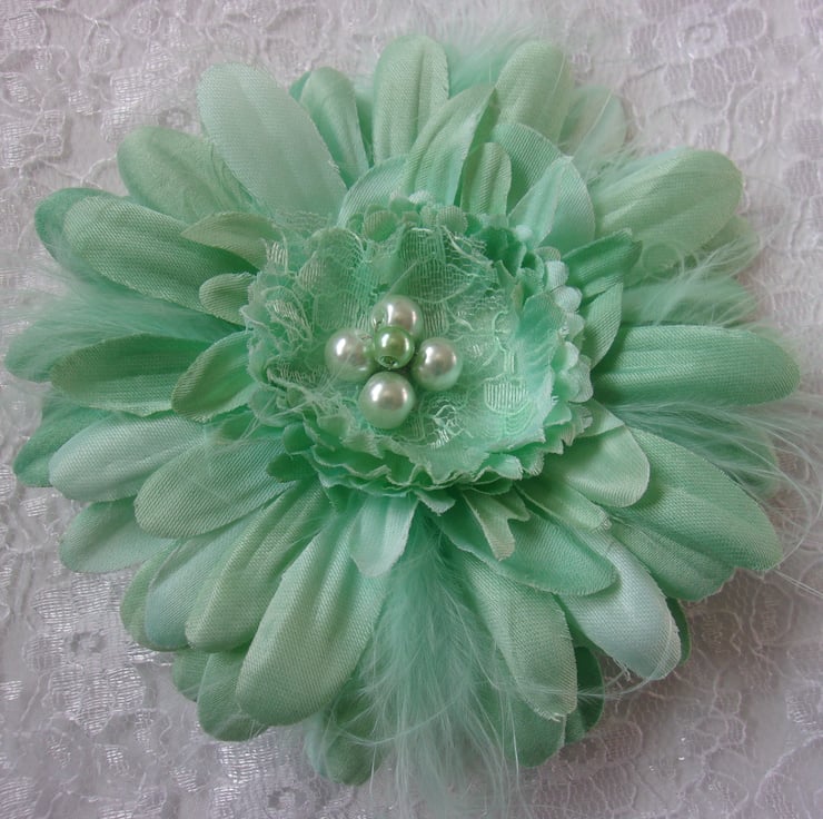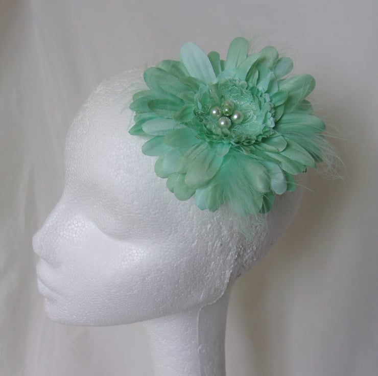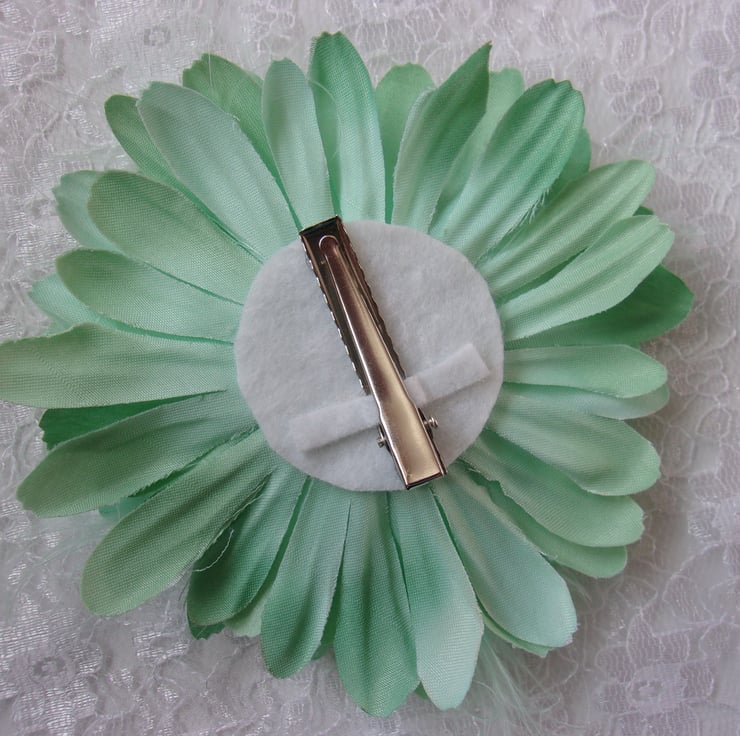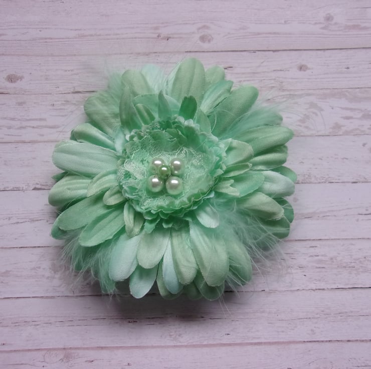 Made with a fabric gerbera daisy flower, with mint fluff feathers and a cluster of mint pearls and lace pieces in the centre.