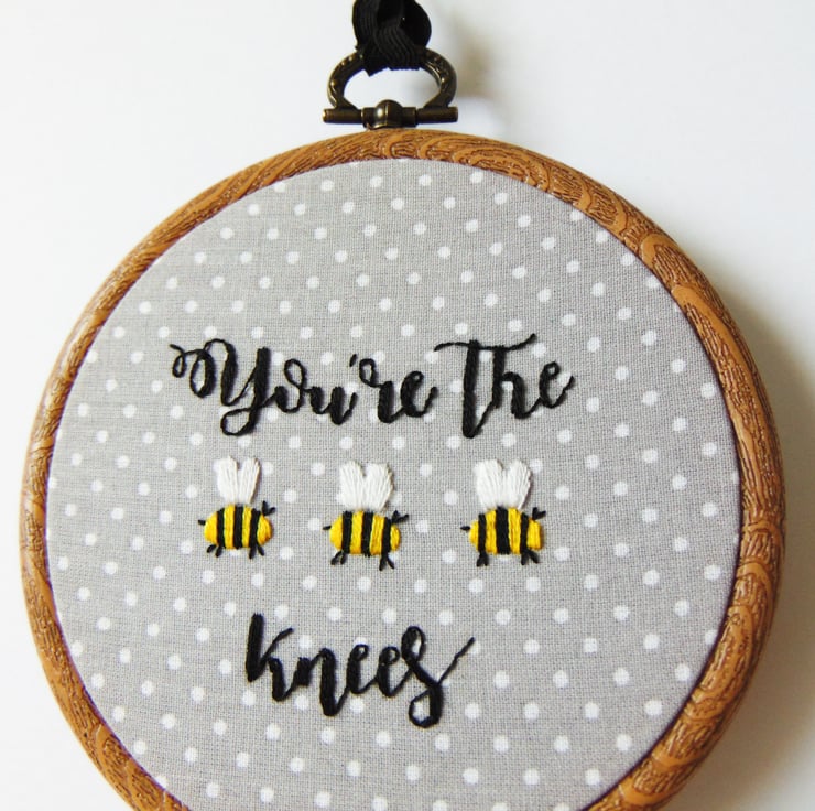 This hoop will be custom made to order, sewn onto 100% cotton fabric and set in an ornate wood grain style embroidery hoop. The back of the hoop is finished with a simple pleated running stitch and ribbon will be included for hanging. All my designs are original and entirely hand stitched to order. I ship worldwide from the UK. Your hoop will come wrapped in my signature logo vellum paper with twine, business card and flyer.