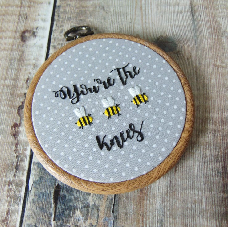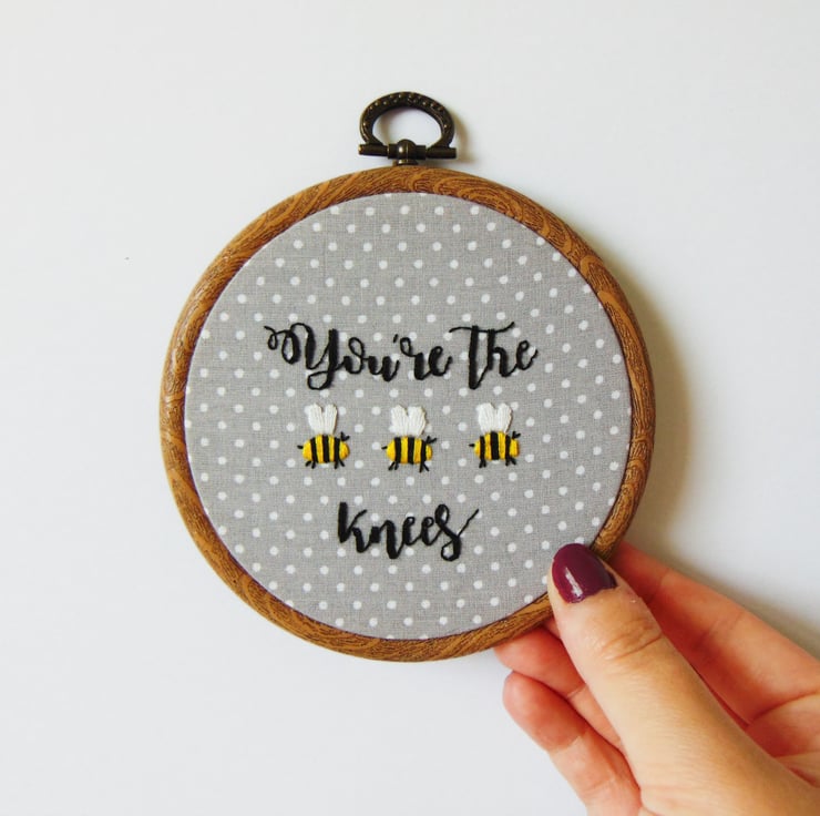 This is a cute and fun gift for an awesome friend. It is an original Flossy Stitch design, entirely hand stitched to order and can be personalised with any name of your choosing. It is sewn onto a gorgeous grey polka dot fabric, set in a four inch hoop with ribbon for hanging.