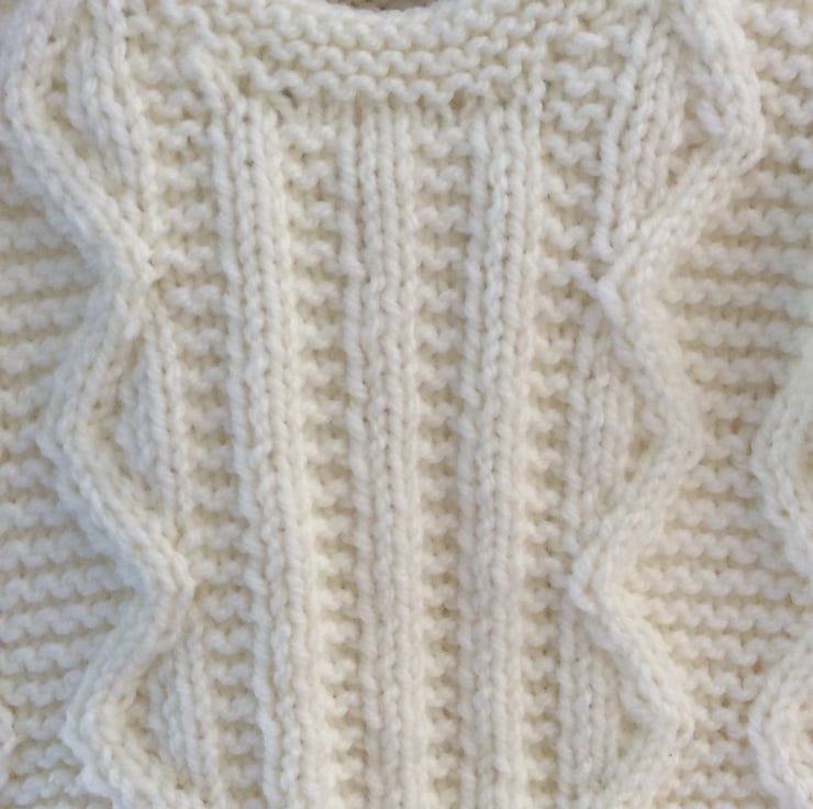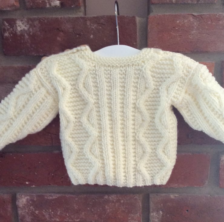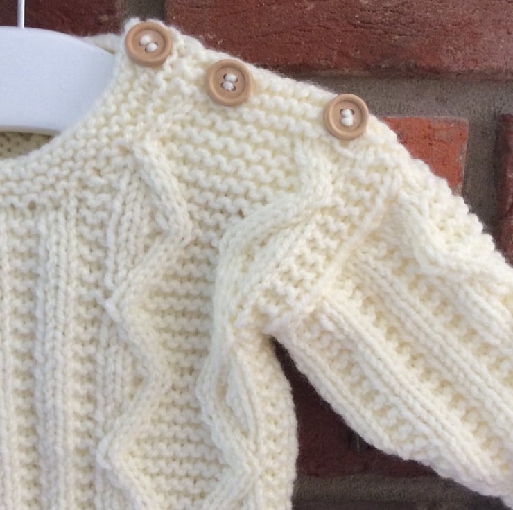 Classic cream colour hand knitted aran jumper to fit a baby from birth to three months approximately. I have used a very soft easy care baby yarn to knit this traditional style baby jumper. The shoulder fastens with three natural colour wooden buttons. Would make a lovely gift for a new baby.