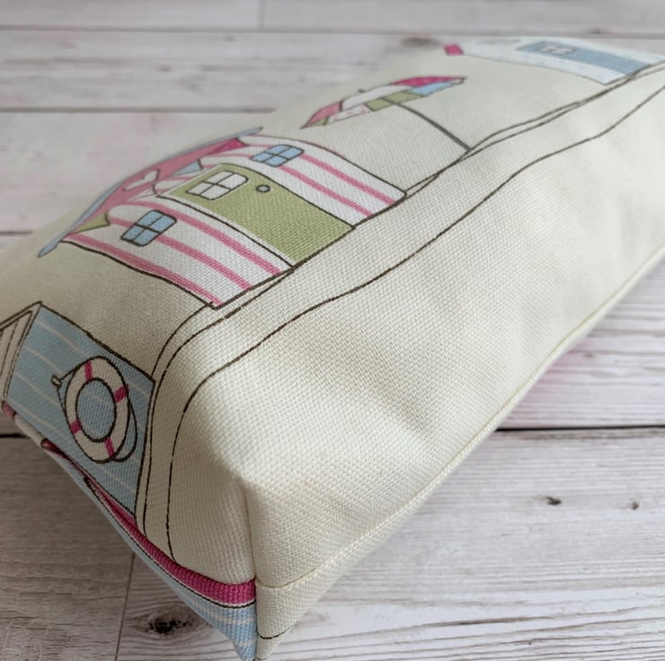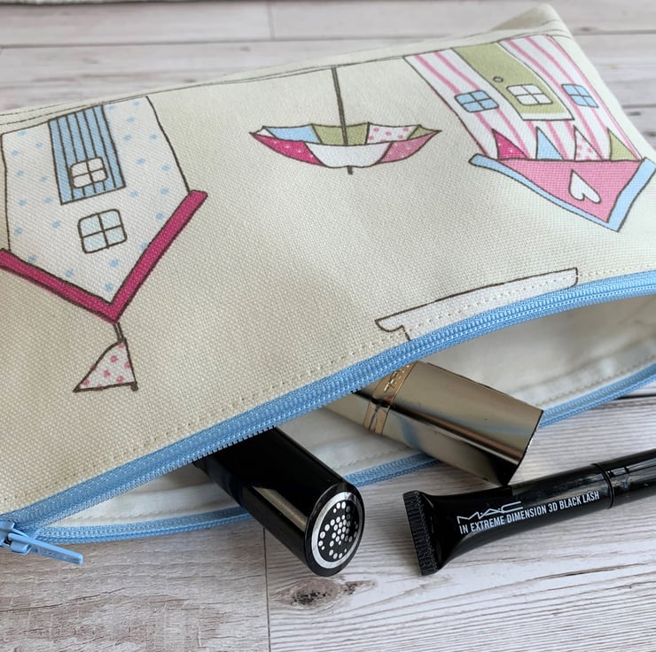 A beach themed make up bag in pleasant pastel coloured fabric. The pattern, in pastel shades of pink, blue, green and white on a cream background, features two beach huts with a parasol between them. The delightful pattern also features bunting, flags and an abundance of stripes and polka dots. The cosmetic bag fastens with a co-ordinating pale blue zip and is lined with cream fabric. The base of the bag is boxed giving lots of space inside.