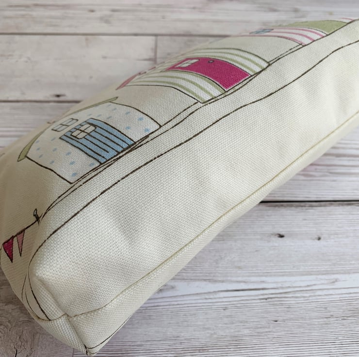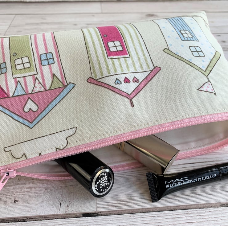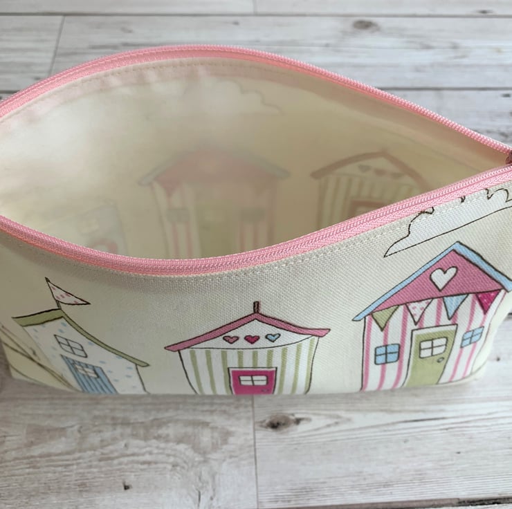 A beach huts make up bag in pretty pastel coloured fabric. The pattern features three beach huts in pastel shades of pink, blue, green and white on a cream background. There are also bunting, flags and an abundance of stripes and polka dots. The cosmetic bag fastens with a co-ordinating pale pink zip and is lined with cream fabric. The base of the bag is boxed giving lots of space inside.