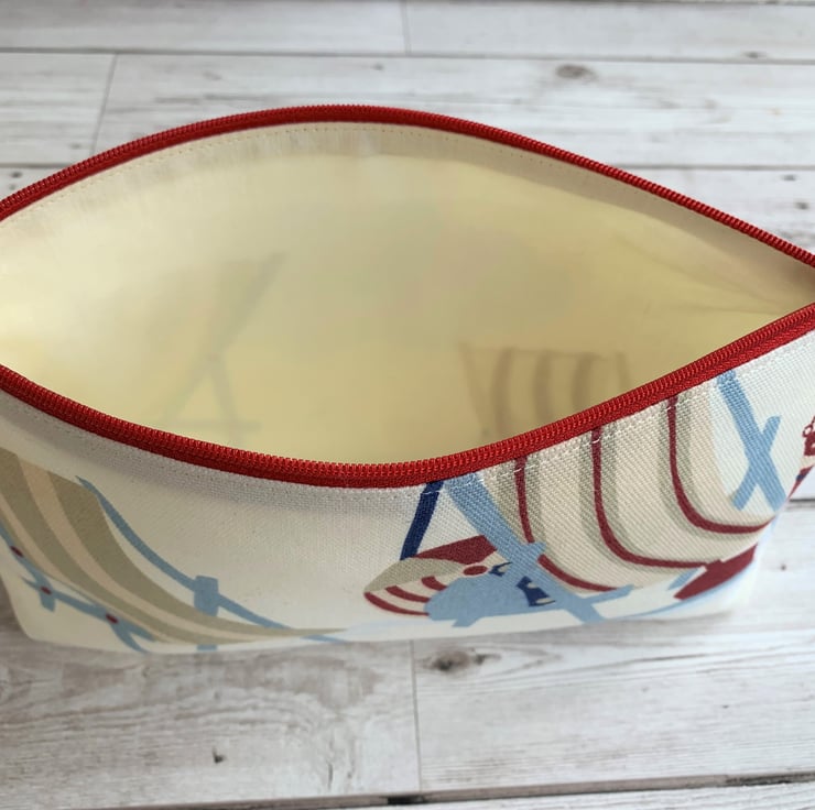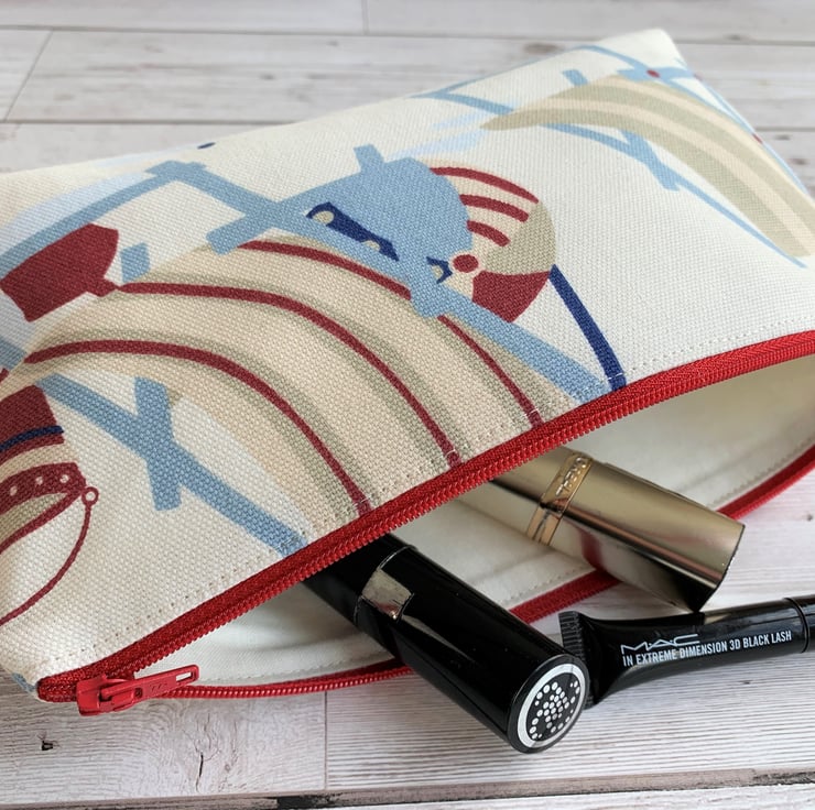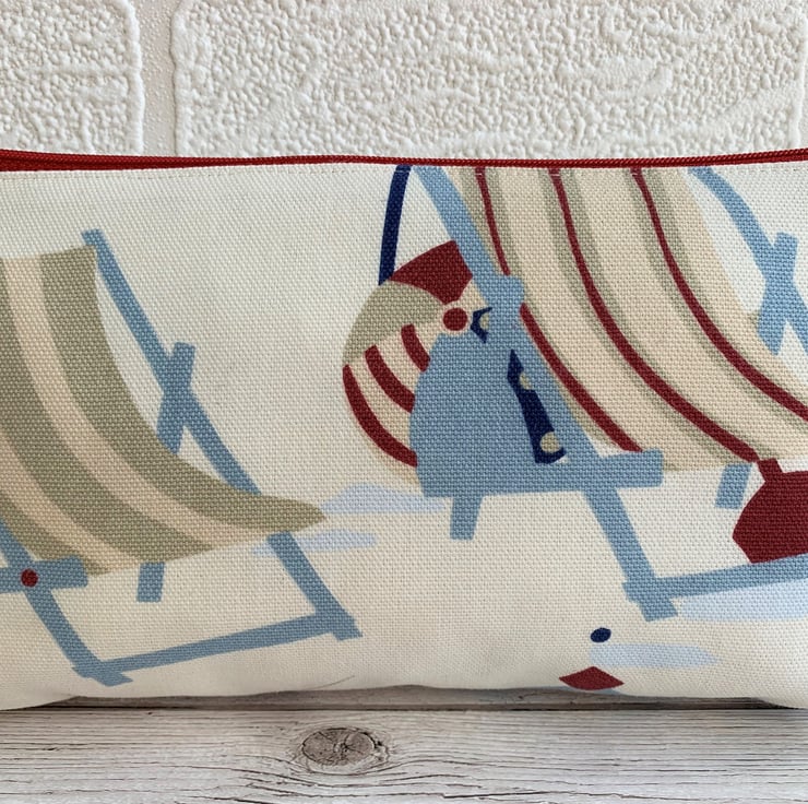 A beach themed make up bag with a delightful seaside print pattern in shades of blue, red and beige. The pattern features two striped deckchairs, a beach ball and a bucket and spade. The cosmetic bag fastens with a co-ordinating red zip and is lined with cream fabric. The base of the bag is boxed giving lots of space inside.