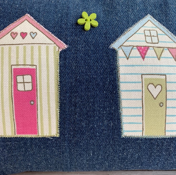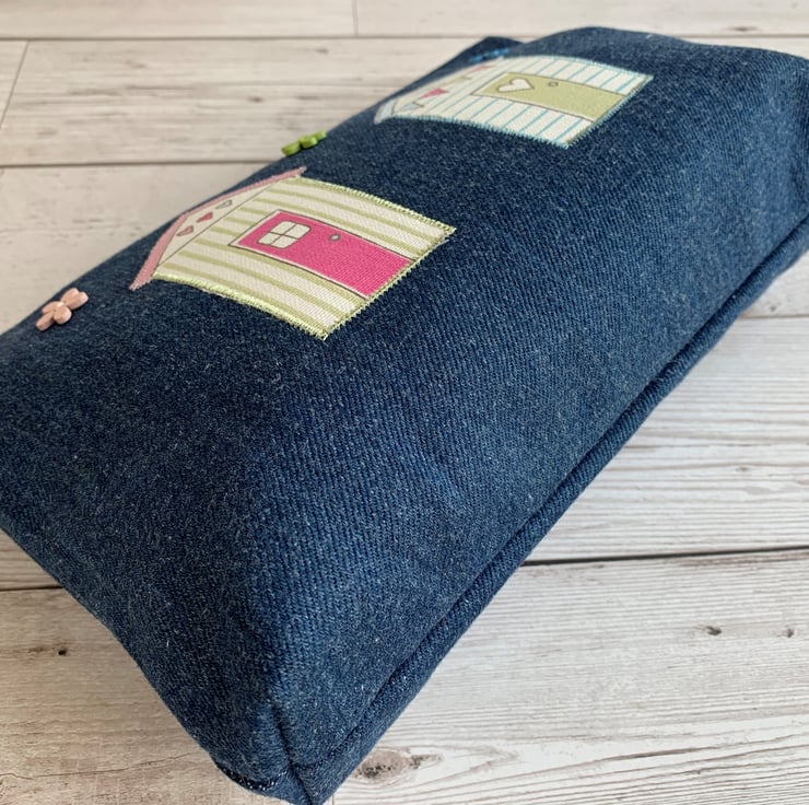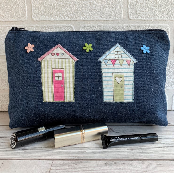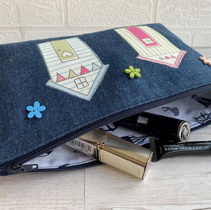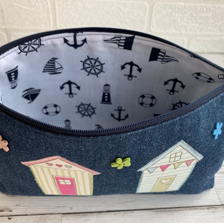 A large make up bag in dark blue denim embellished with two appliqué beach huts and three flower shaped buttons. The appliqué beach huts, in pastel shades of pink, blue, green and white on a cream background, have been cut from beach huts print fabric. I've attached the appliqué pieces and edged them with a narrow machined zigzag stitch. I've also added three flower shaped wooden buttons in green, blue and pale pink. The cosmetic bag fastens with a dark blue zip and is lined with nautical fabric with a pattern of navy blue motifs on a white background. The motifs include lighthouses, yachts, anchors, ship's wheels and life belts. The base of the bag is boxed giving lots of space inside.