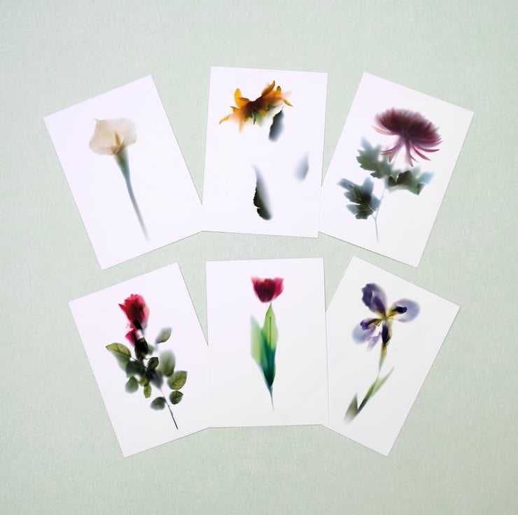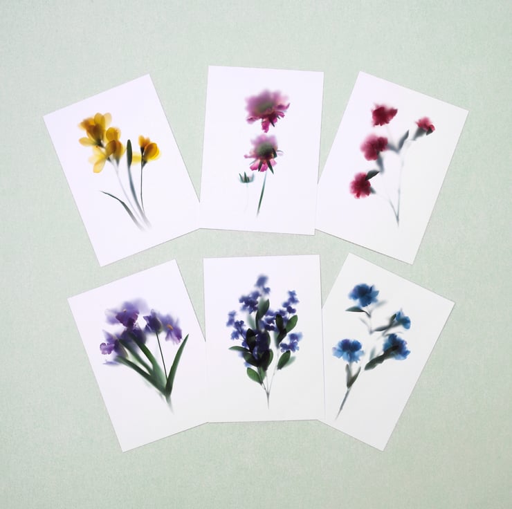 Set of 12 floral postcard prints. Each pack of A6 mini botanical art prints includes 12 different abstract flower designs.
