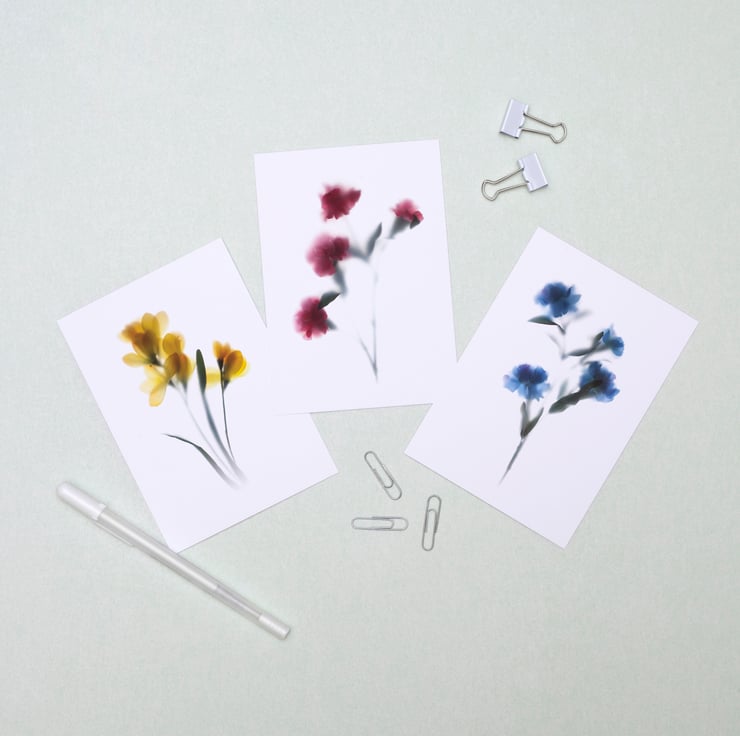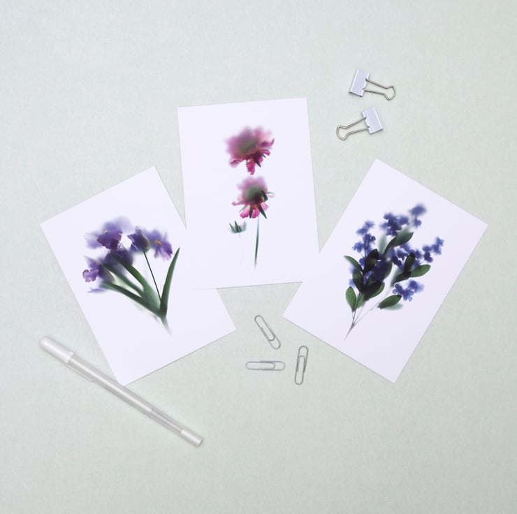 Set of 6 floral postcard prints. Each pack of A6 mini botanical art prints includes 6 different abstract flower designs.