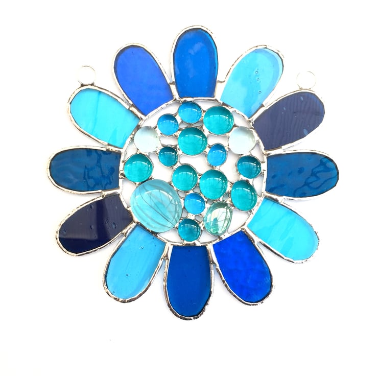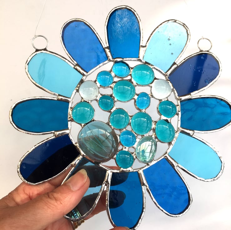 Each of the 12 daisy petals measure 3 cms by 4 cms and there are also 17 globs in the centre. The overall size of the suncatcher is 17.5 cms in diameter. Each piece has been copper foiled, soldered and left with a silver finish. Two rings and a short length of fishing line have been attached for hanging purposes.