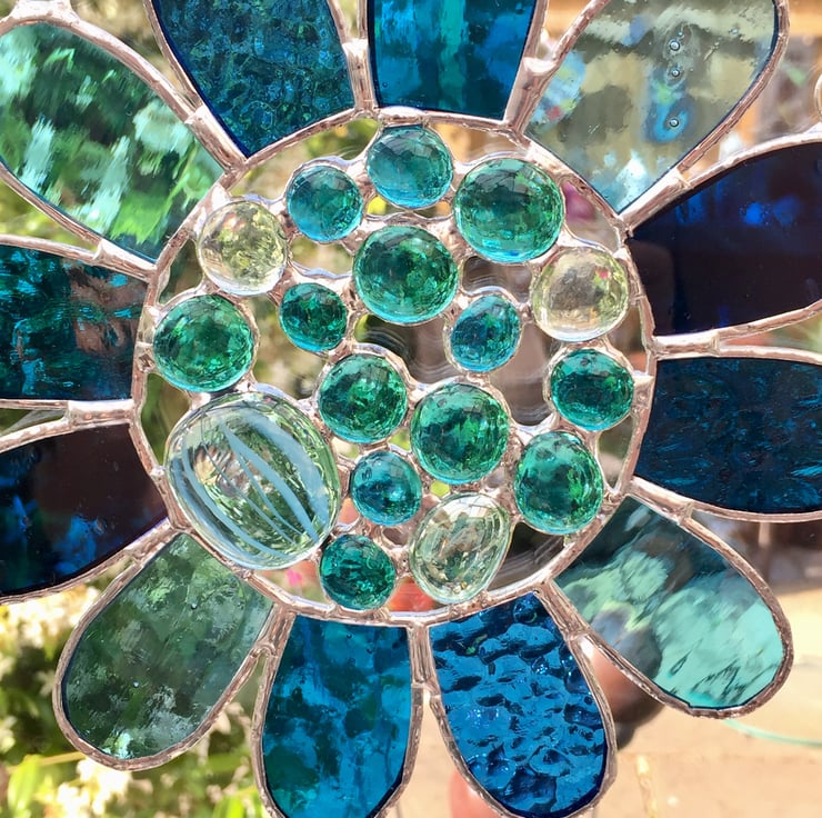 This one has been made from 6 different types of turquoise and teal stained glass with a selection of glass globs in the middle.