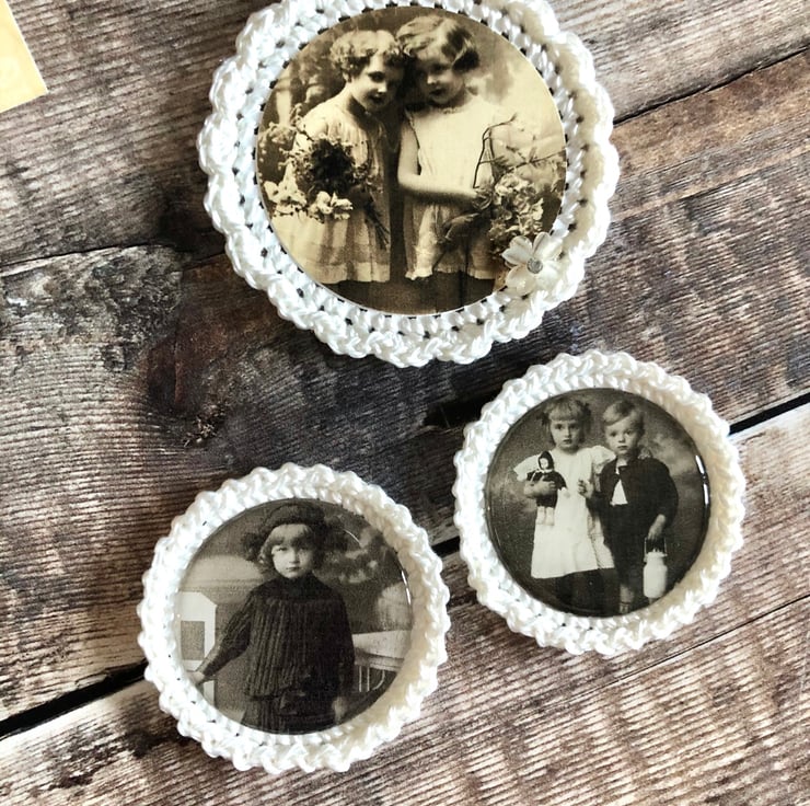 3 x hand crocheted images .. one has a little flower embellishment on it .. 2 of them are covered with clear domed epoxy stickers