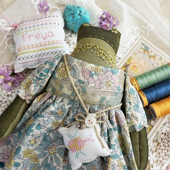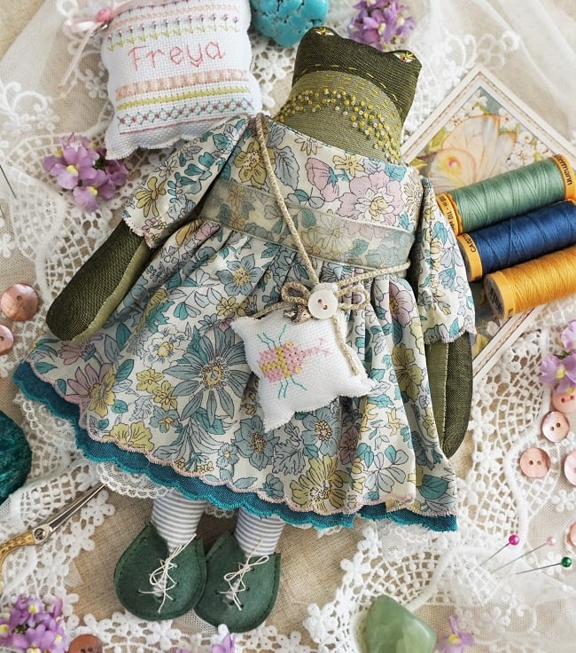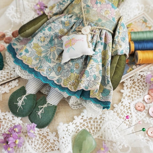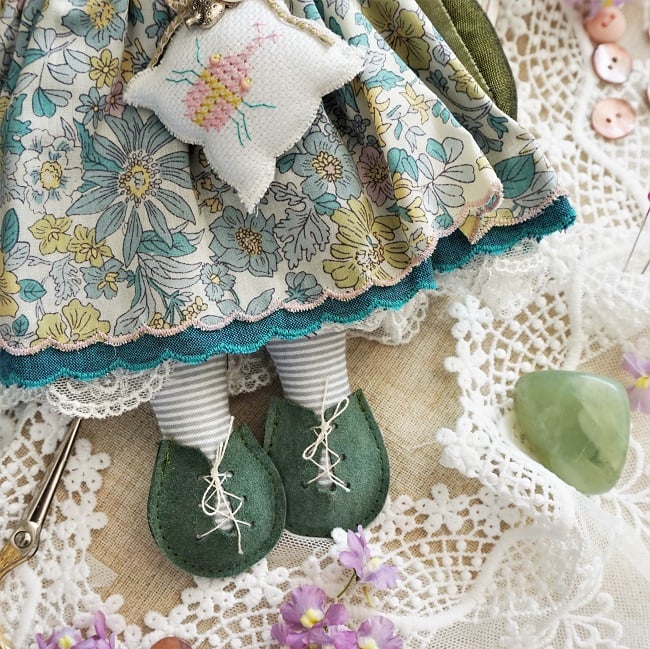 She is softly stuffed with a good stuffing, has a turquoise crystal heart for strength and lots of lavender in her stuffing for a gentle scent. She is finished with organza ribbon, tiny buttons and little leather shoes. She sports a lavender sachet with a beetle embroidered on it.