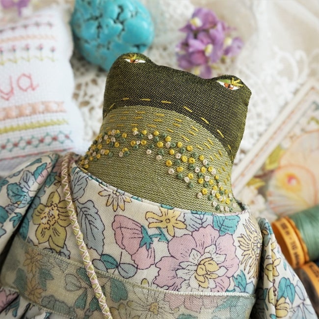 I love my grumpy frogs and really enjoy the embroidery and dressing them in the best fabric. This is a new size, only nine inches. They are smaller and sweeter than their bigger sisters with lots of lovely embroidery xx