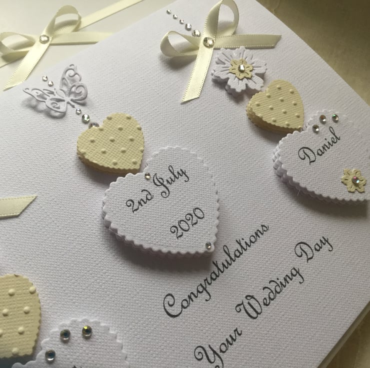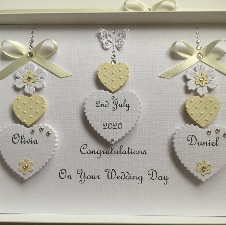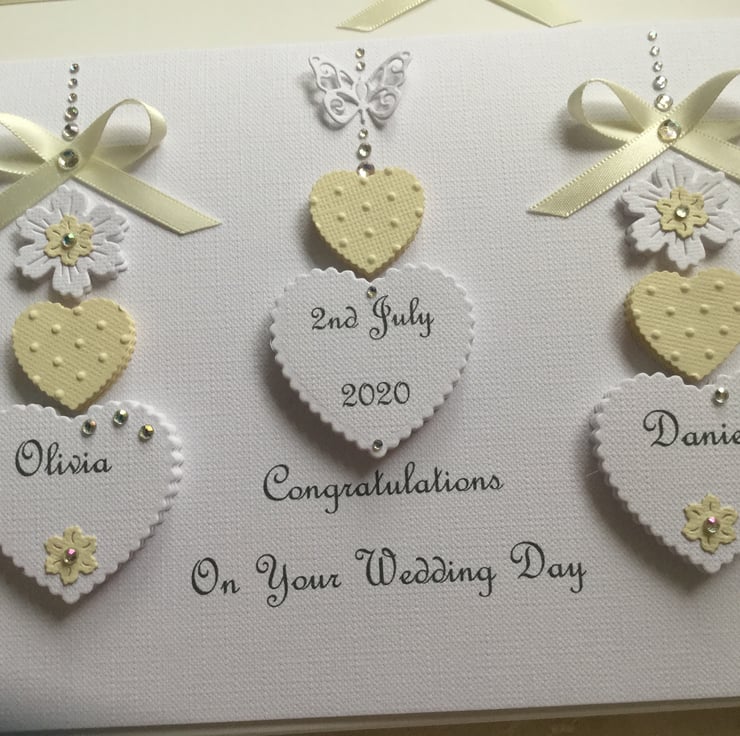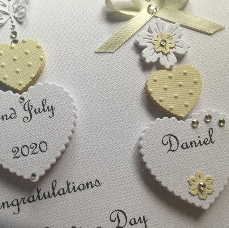 This card is personalised with the names of the couple in the hearts, the date of the special occasion along with the greeting of your choice at the bottom of the front of the card. Please contact me with your personalisation requirements when you place your order.