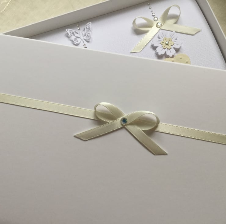 This handmade card is A5 in size (210mm x 150mm) on 300gsm heavyweight linen cardstock and can be for a wedding, engagement, anniversary or any other special occasion for a couple. This ivory and white hearts card is decorated with ribbons and gems. I make each card to order and they can be personalised inside as well as on the front of the card.