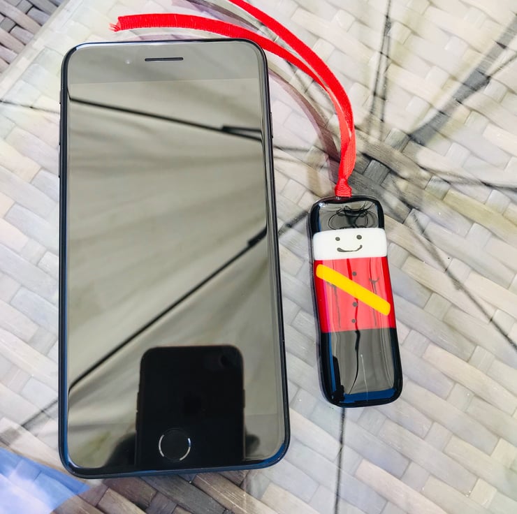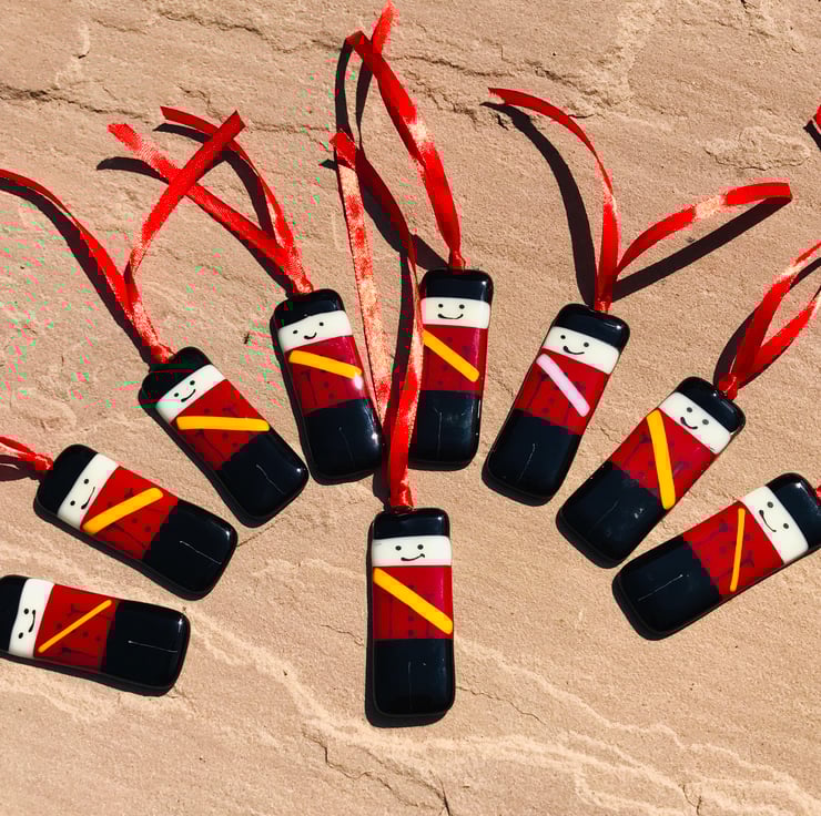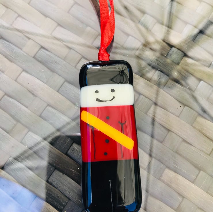Fused glass soldier Christmas tree decoration. Little happy fused glass soldiers will look very cute on your Christmas tree .. Beautifully tactile . Measure approximately 3 inch long by 1inch wide . Makes a lovely gift or secret santa.