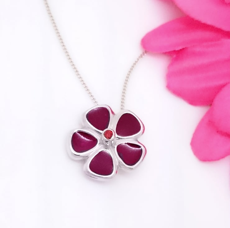A very pretty solid silver pendant featuring our classic five petal flower on a larger scale, this design is perfect for all ages and is truly timeless. The chunky floral pendant measures approximately 20mm across and features two bales securely soldered to the back of the design to allow the pendant to hang beautifully from the chain. The pendant has been set with a garnet (birthstone for January) and is accented with a gorgeous, deep red cold enamel.