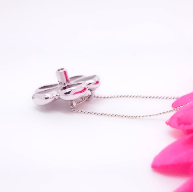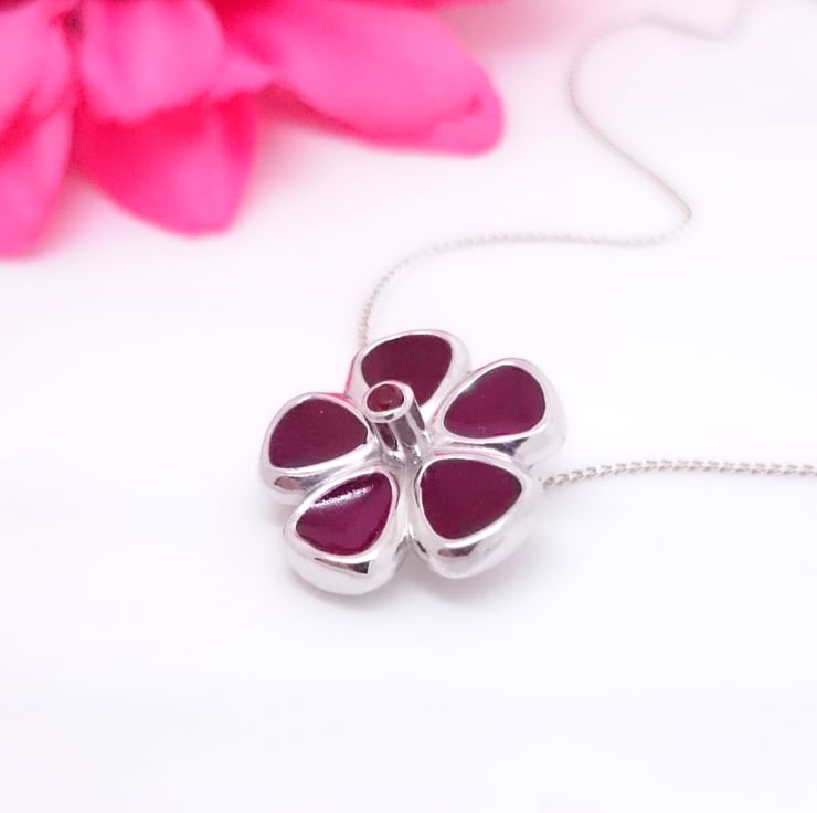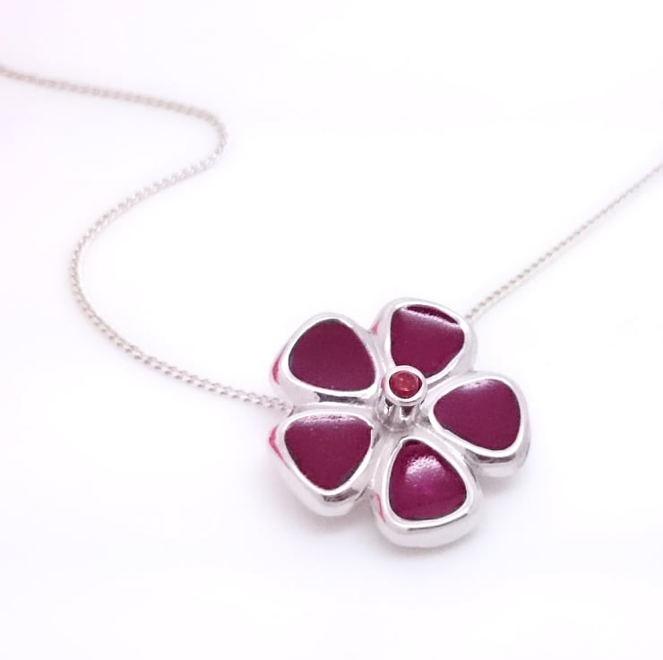 A very pretty solid silver pendant featuring our classic five petal flower on a larger scale, this design is perfect for all ages and is truly timeless. The chunky floral pendant measures approximately 20mm across and features two bales securely soldered to the back of the design to allow the pendant to hang beautifully from the chain. The pendant has been set with a garnet (birthstone for January) and is accented with a gorgeous, deep red cold enamel.