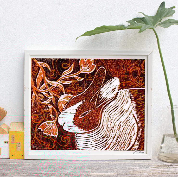 A giclée rabbit print of an original woodblock print that I created. It measures approximately 30 x 21cm including artists signature, the paper size is A4. The print is on high-quality 350gsm acid-free watercolour paper and is hand signed.
