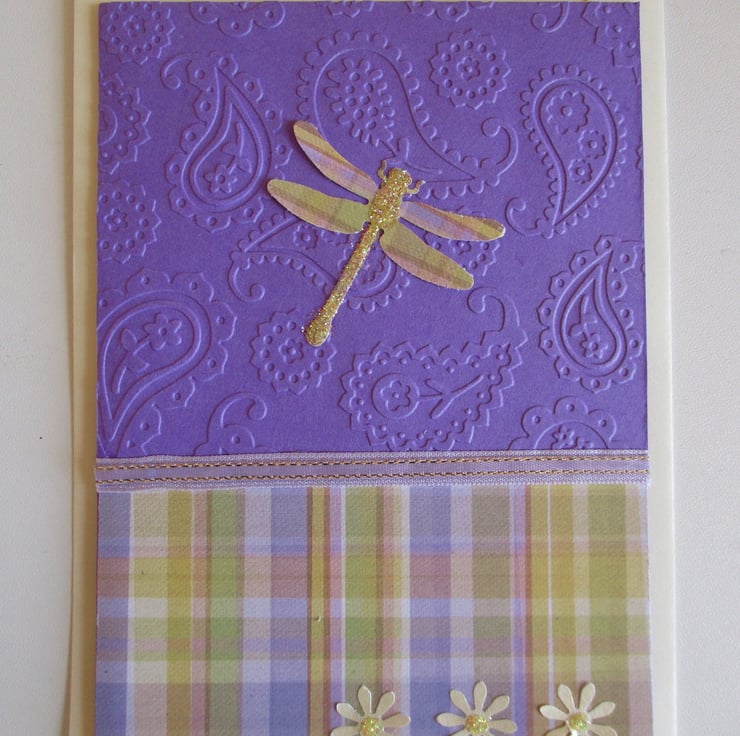 Embellished with a yellow glitter plaid paper dragonfly and 3 daisy flowers.