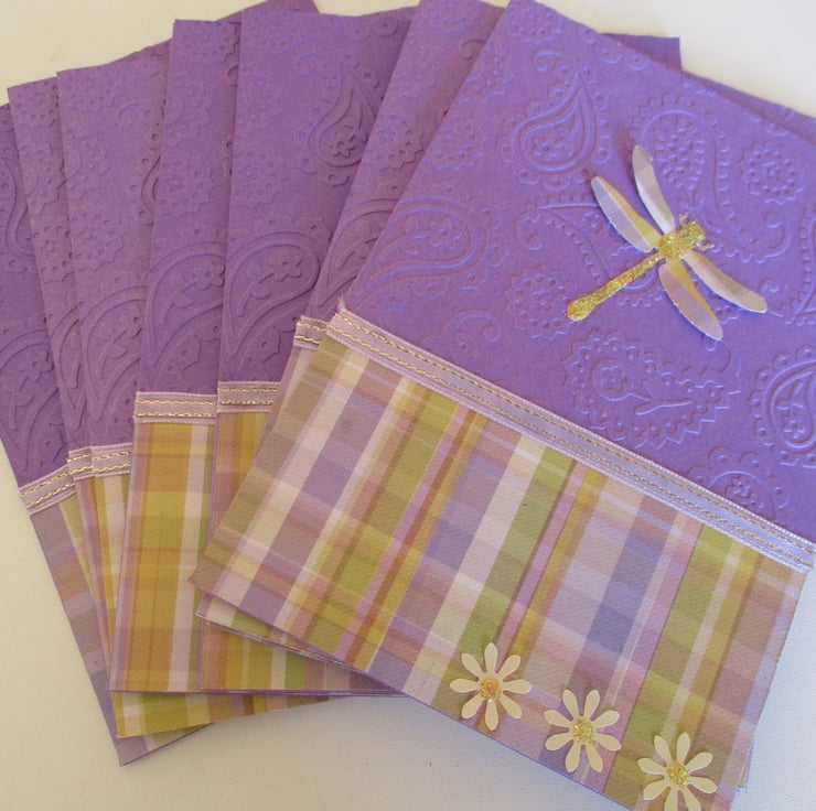 Set of 8 handcrafted paisley and plaid dragonfly blank notecards