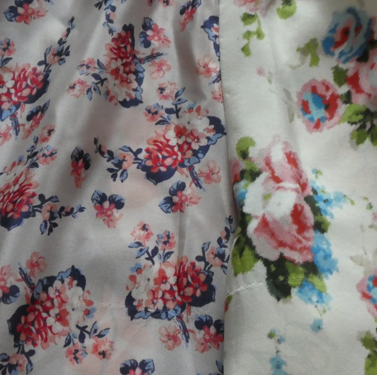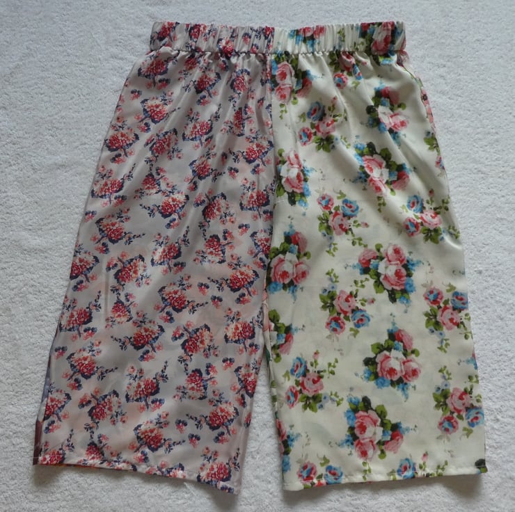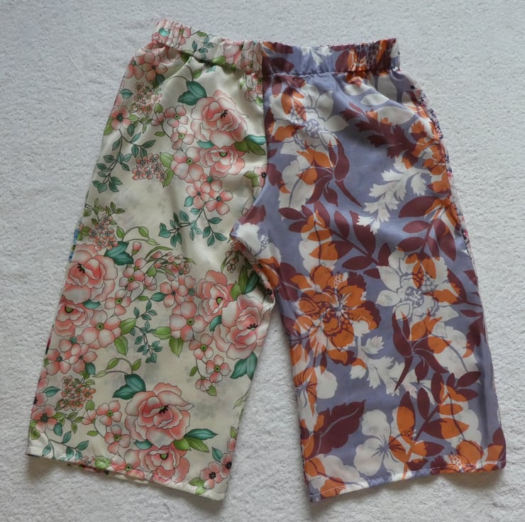 There are 4 different print patterned silk panels used, one for each part of the leg, to make a unique and funky garment. All seams have been professionally finished with an over-locker. The waistband is elasticated for a comfy fit.