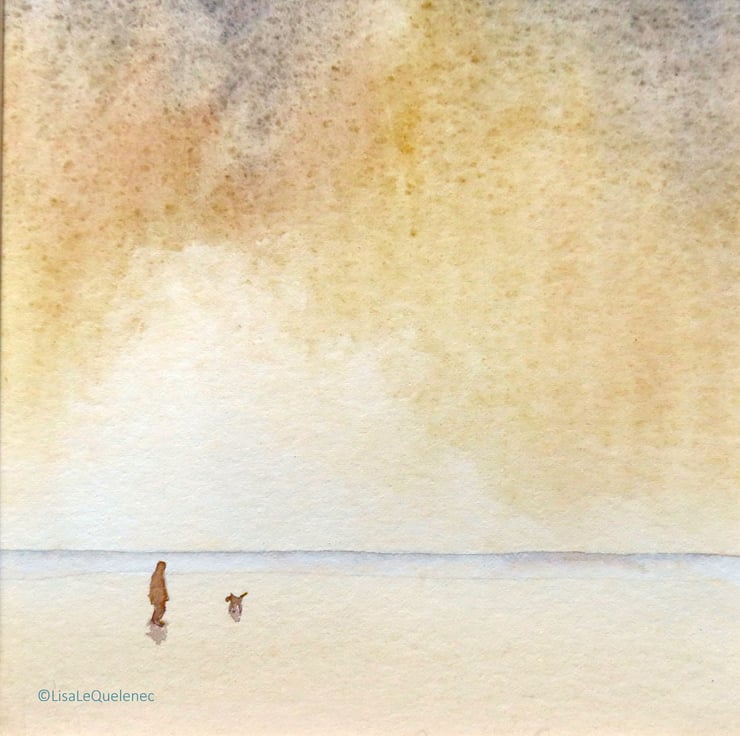 Always by your side - walking the dog on a sunset beach. This is an original watercolour painting measuring 15.5x15.5cm (6x6inch approx) that comes mounted in an off white board measuring 30x30cm (12x12inch) which is a standard frame size.