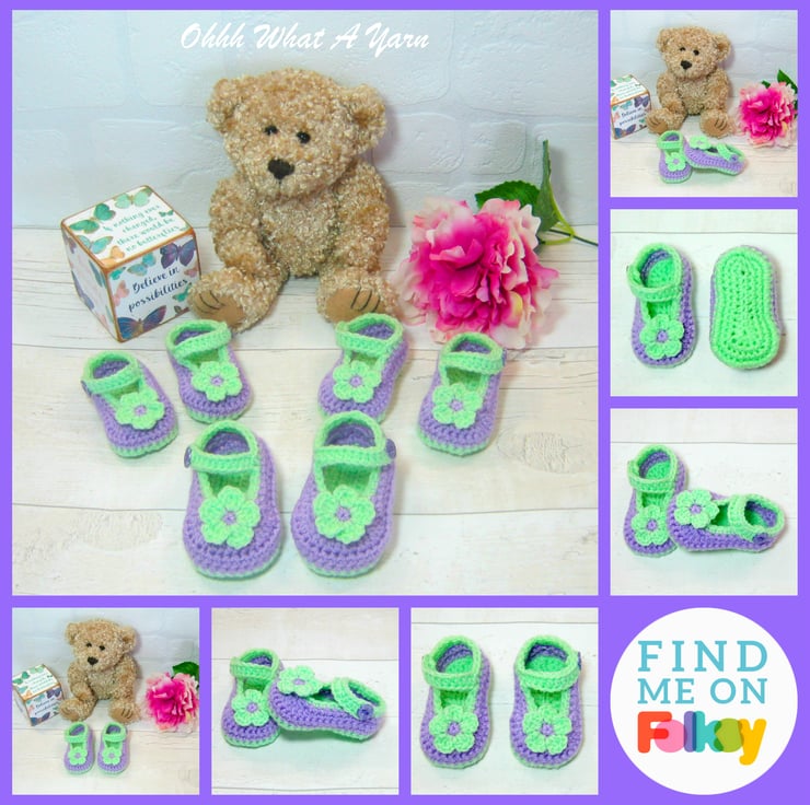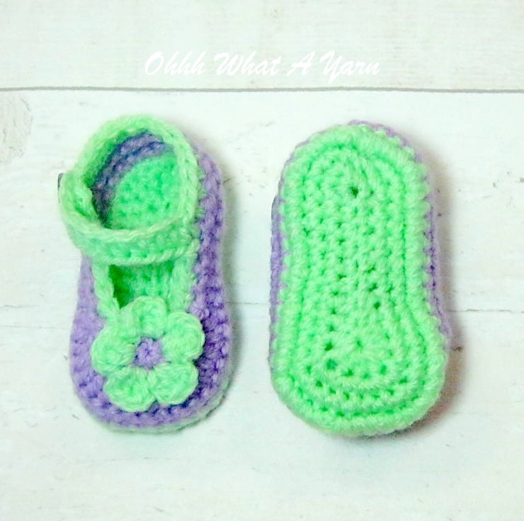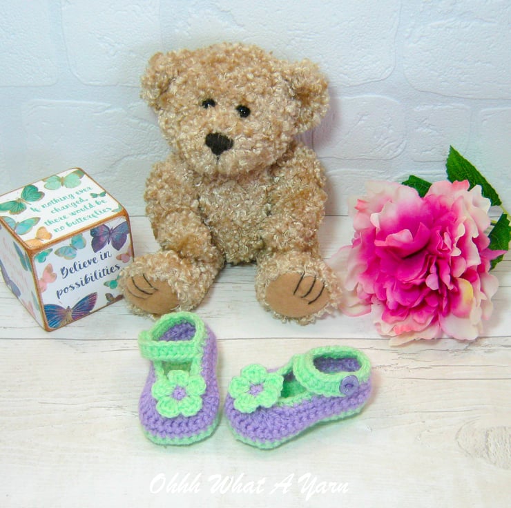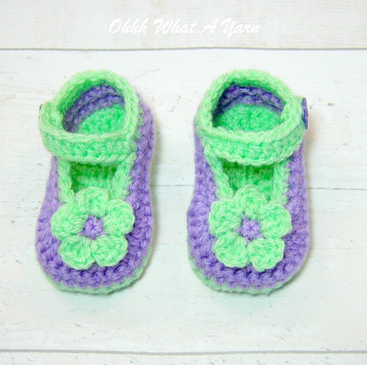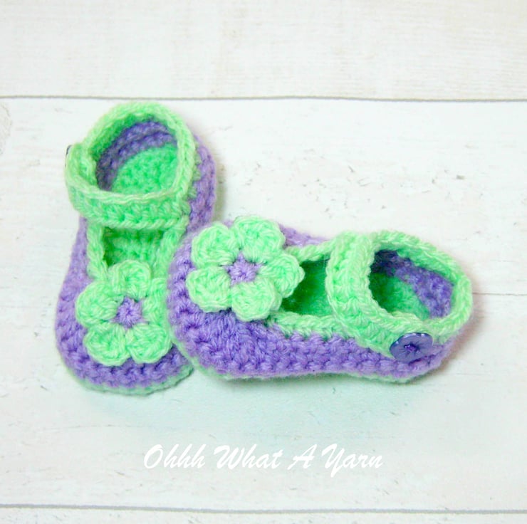 These gorgeous lilac and green crochet shoes are crocheted in 100% acrylic yarns. They have a pretty flower button to fasten the little strap and a crocheted flower for decoration on the front of the shoe.