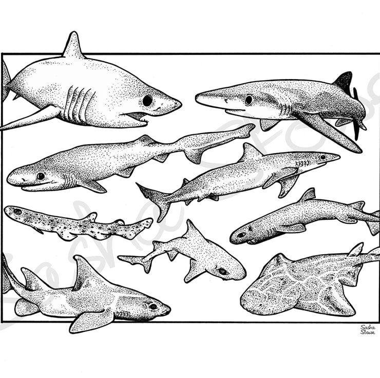 Inspired by Shark Awareness Day I illustrated this piece with nine different sharks that come to British waters. The original illustration was done using fine-liners and the stippling technique to show tonal variation.