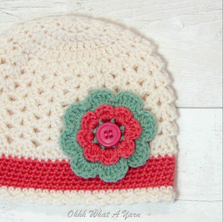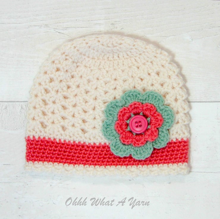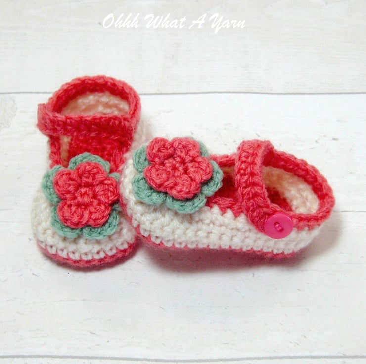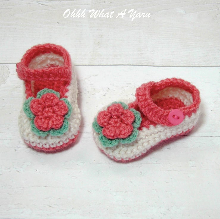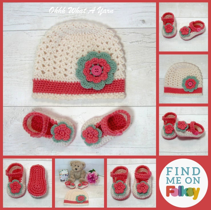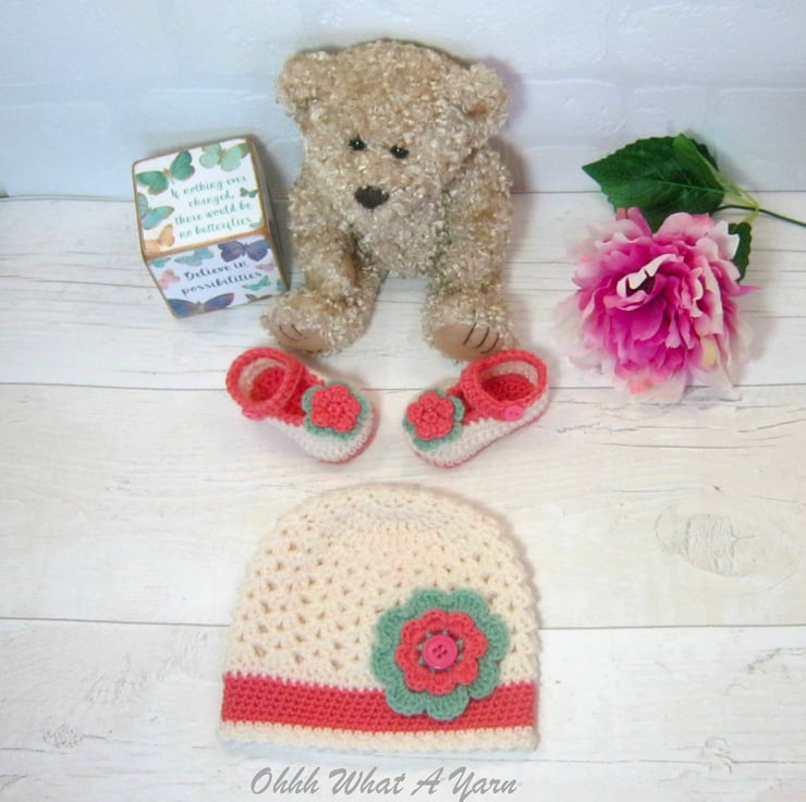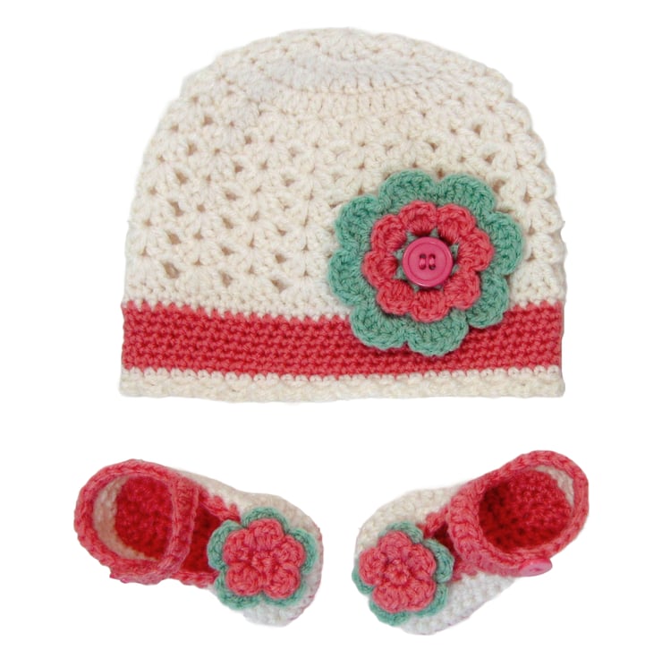 The hat has a lovely shell pattern with a contrasting coral trim around the bottom and a cream edge and has a two layer crochet flower with a button for decoration. The little shoes have a coral sole, cream upper and are decorated with a matching two layer flower and they fasten with a little coral coloured button.