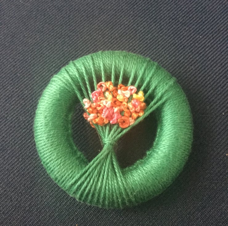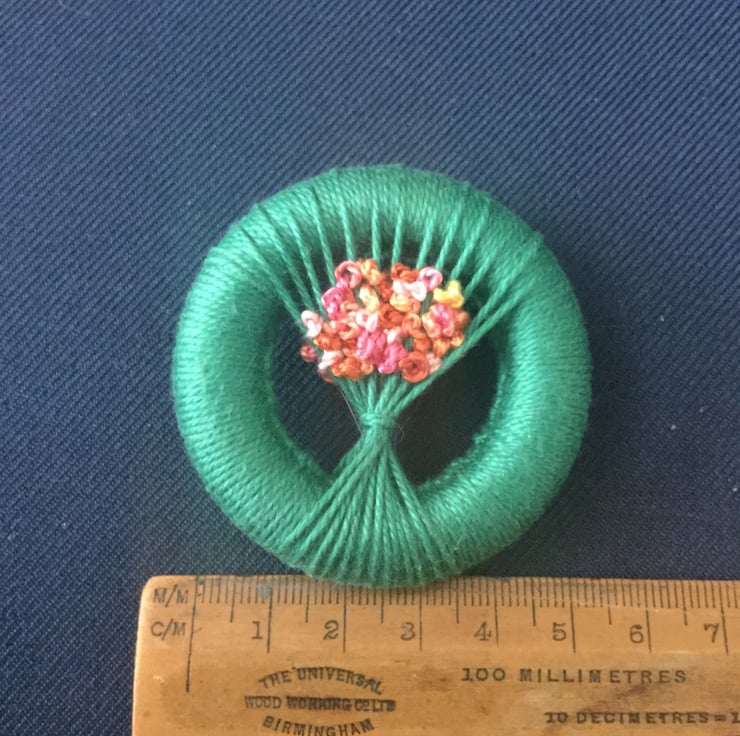 It is worked on a wooden ring and measures 5.5 cm across. The ring is covered in a jade green cotton thread and the posy blossoms are worked in French knots in tropical shades of pink, orange and yellow. The second image shows colours best.