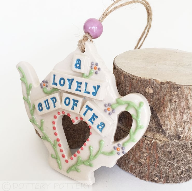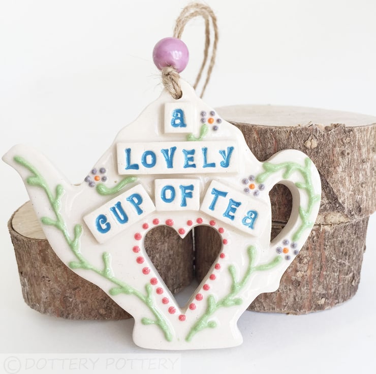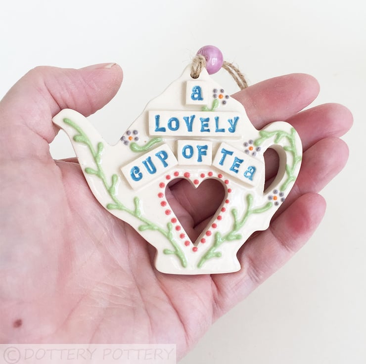This little hanging teapot decoration is made from white earthenware clay and has been decorated with a bright pattern. It is finished with a matching ceramic bead and measures 8cm x 9.5cm x 1cm