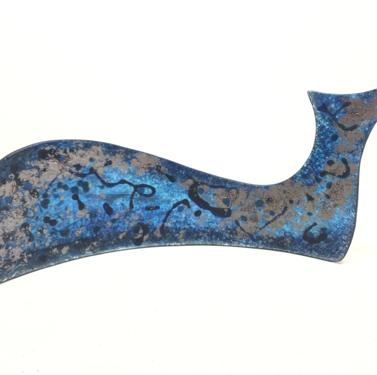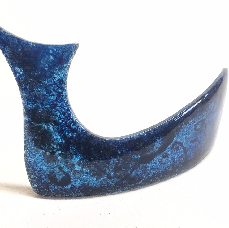 Kiln fused glass is a process where glass is layered and heated in a kiln to a temperature where the glass melts and the layers fuse together. My whales are made up of layers of glass sheet and powder and other inclusions. Each whale is fused, cold-worked and then slumped, a process that takes many kiln firings to complete over many days. Each piece is unique.