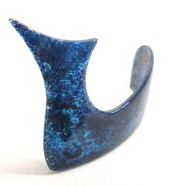 It is slightly curved so that it can stand and catch the light. It has a smooth gloss front and a textured back with copper powder inclusion.