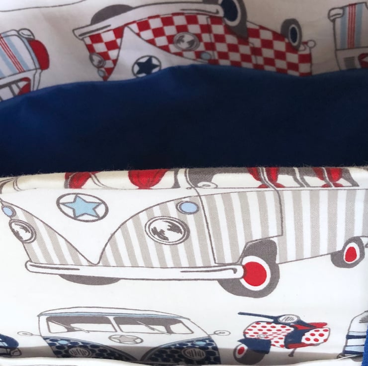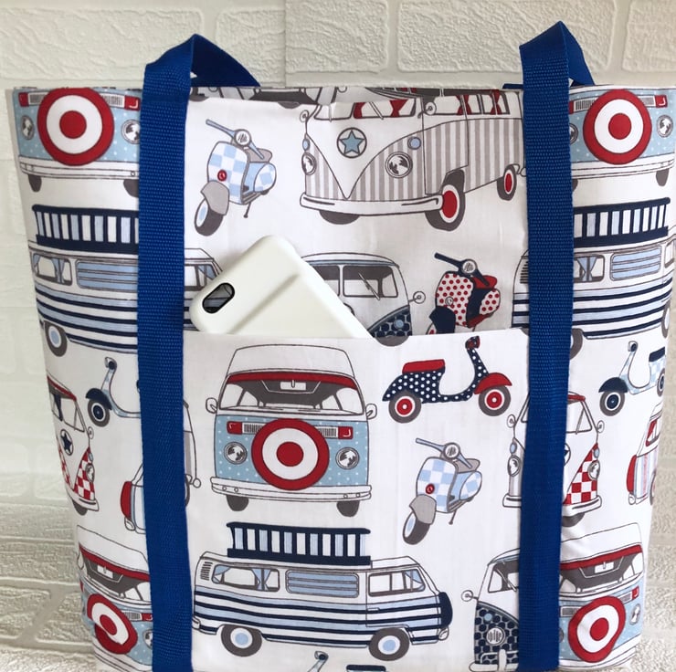 This large shoulder bag is made from a 100% camper van and scooter print cotton.