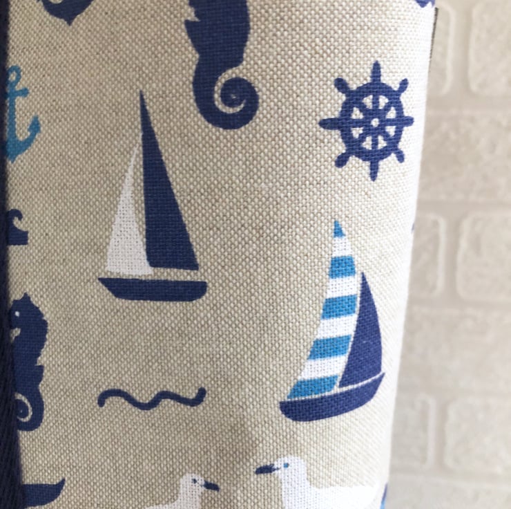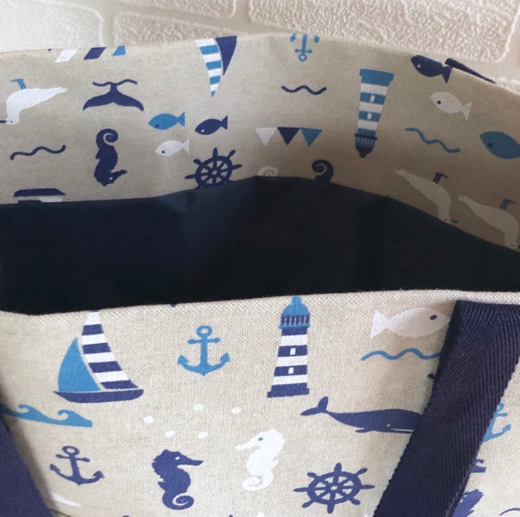 This large shoulder bag is made from a cotton, linen mix seaside themed print and lined with a navy blue waterproof lining,so perfect for wet swimwear or picnic spills. The handles are a dark navy cotton webbing.