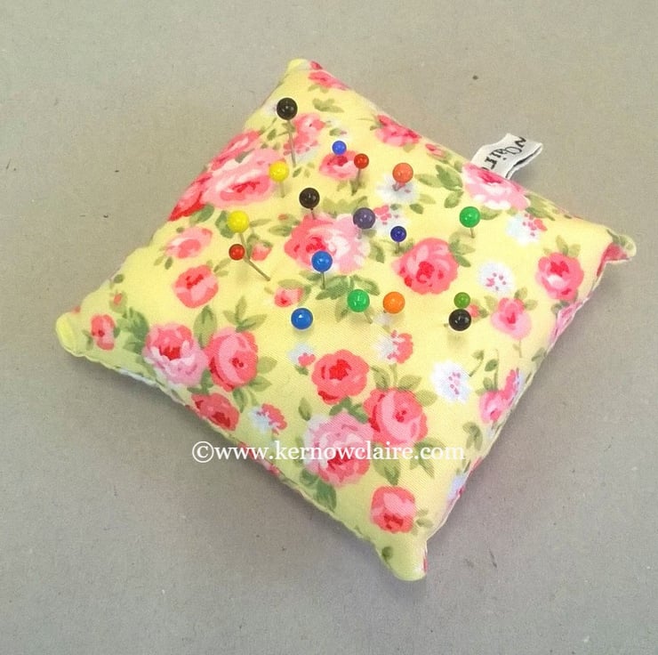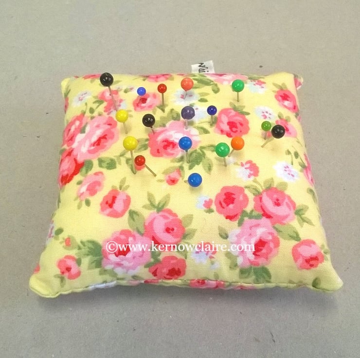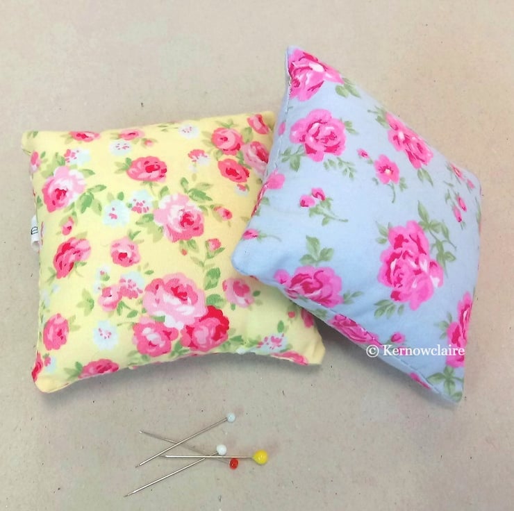 This is a lovely set of two small pin cushions, handmade in pretty cotton fabrics. One in pale blue with pink flowers and one in yellow with pink flowers. Small size but perfect to keep pins safe and organised.