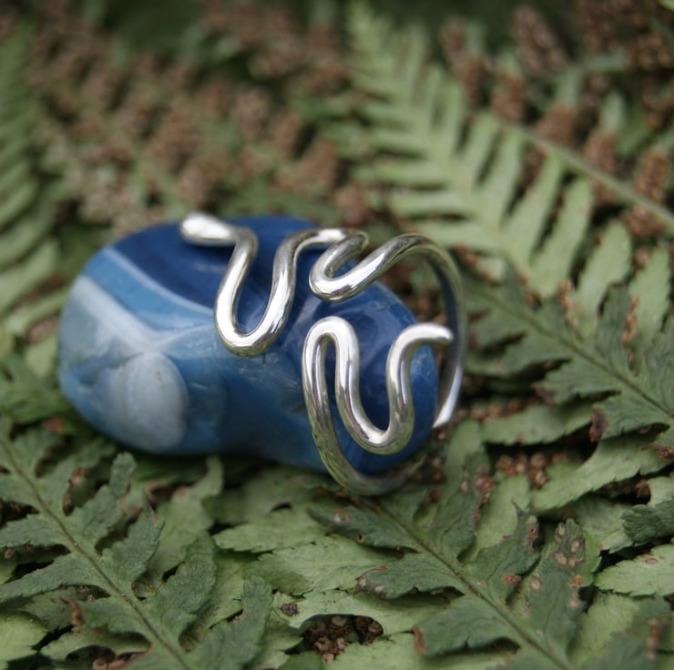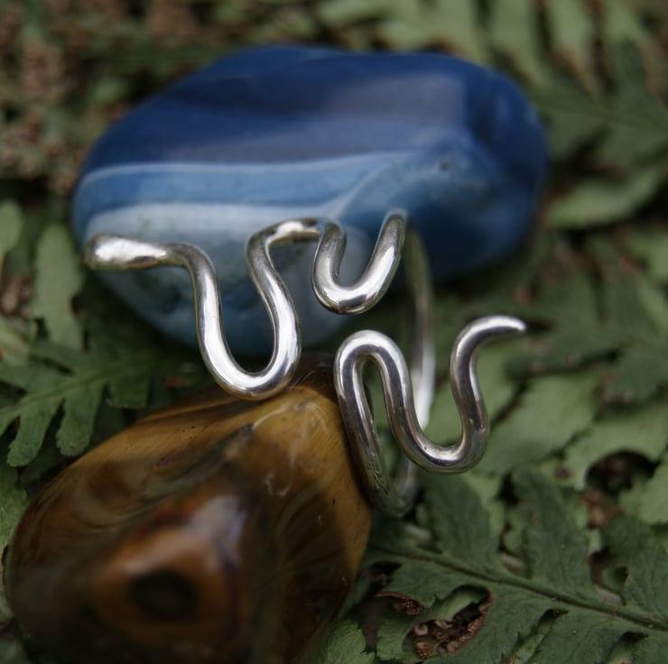 The head of the snake is fused to a ball by melting the end of the silver wire with my jeweller’s torch. The ring winds to imitate a serpent’s body, the tapered tail achieved by filing curls into an S like shape. The silver is highly polished with a mirror like shine.