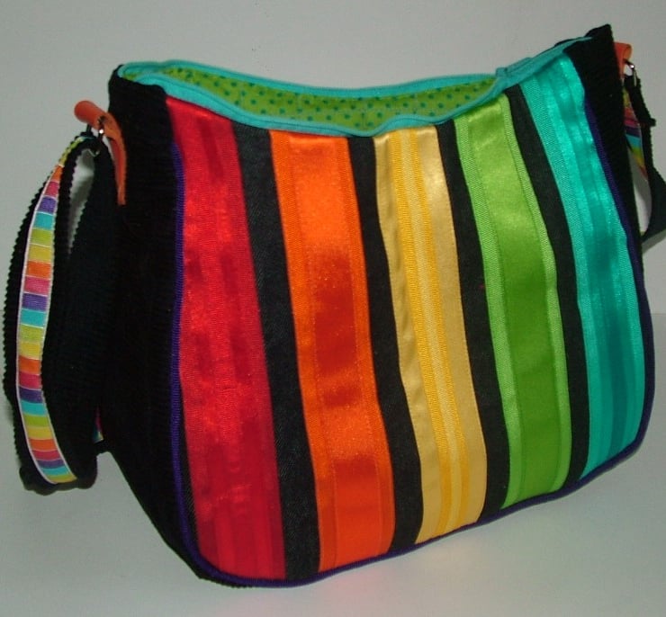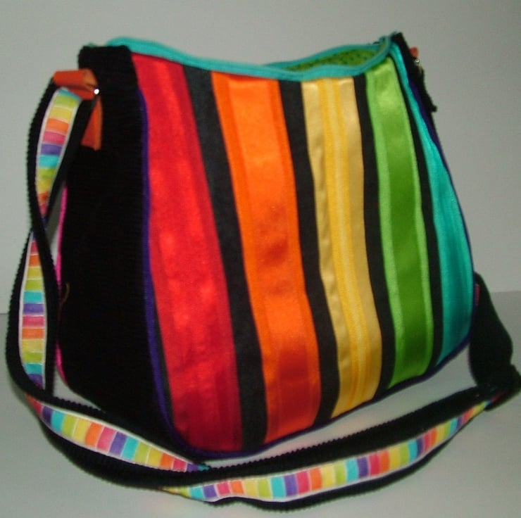 the back panel is also a blue denim panel this time overlaid with satin ribbon in 5 different colours to create a rainbow effect.