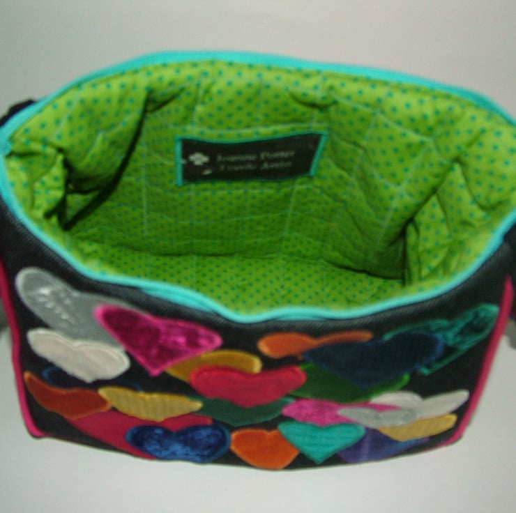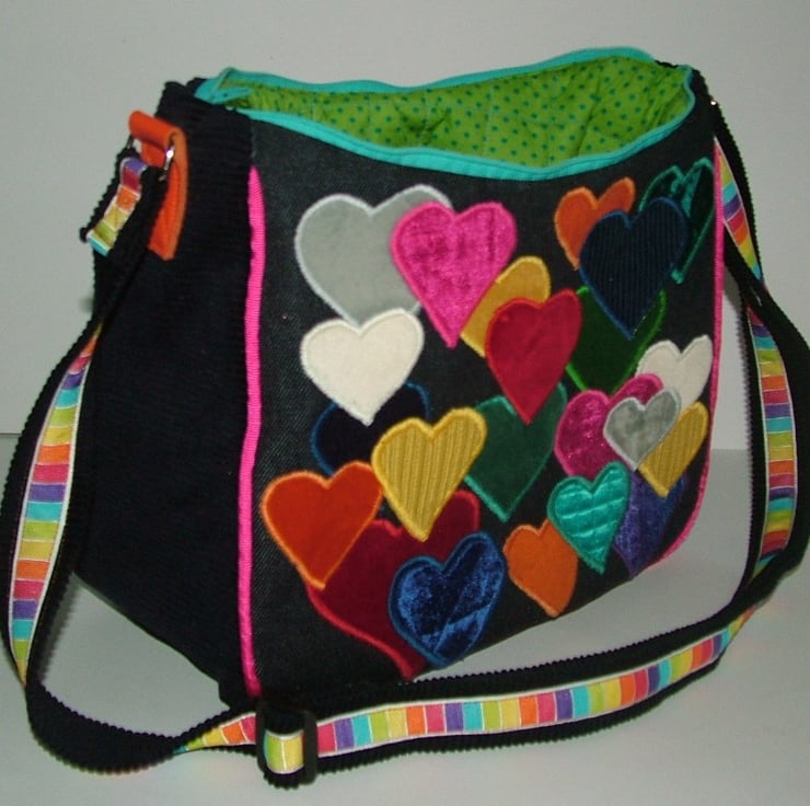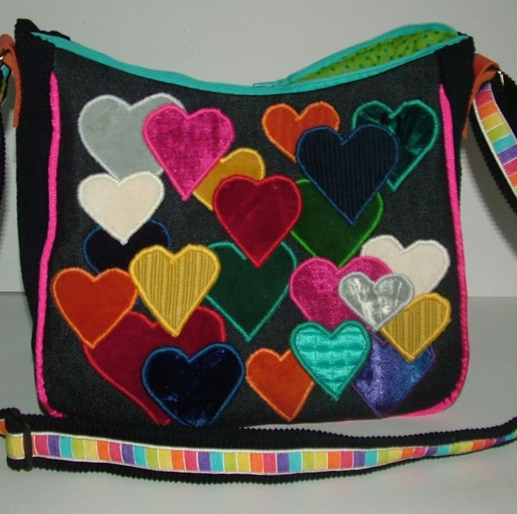 The front panel is a blue denim that has been overlaid with 22 velvet and corduroy hearts in many, many colours. Each heart has been appliqued with matching zig zag stitching.