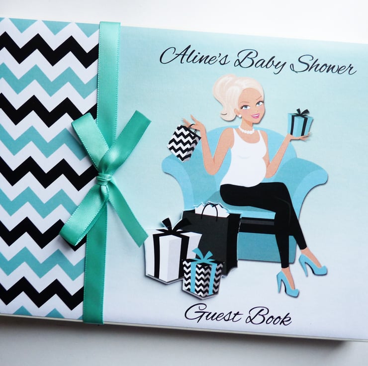This Baby Shower Guest Book (First Birthday Book) is decorated with embellishments and a ribbon.
