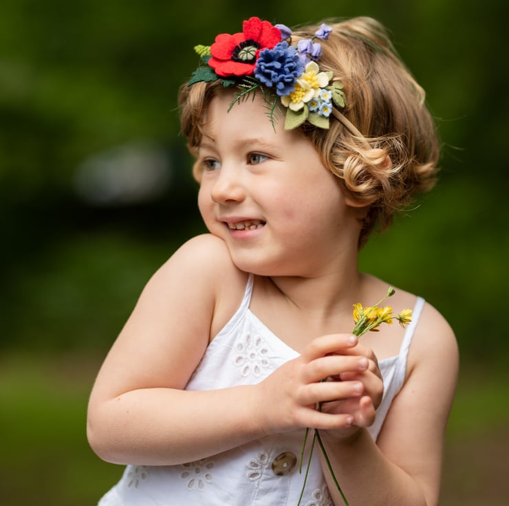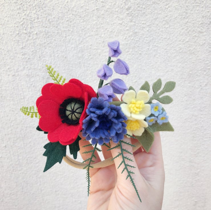 This beautiful wildflower crown is made with wool felt and adorned with greenery. An ideal spring headband adorned with a felt poppy, cornflower, buttercups and bluebells.