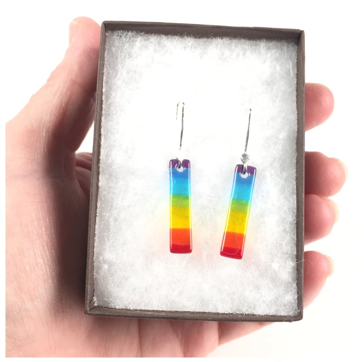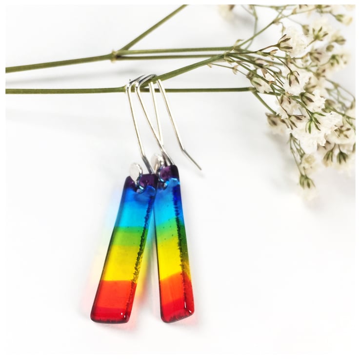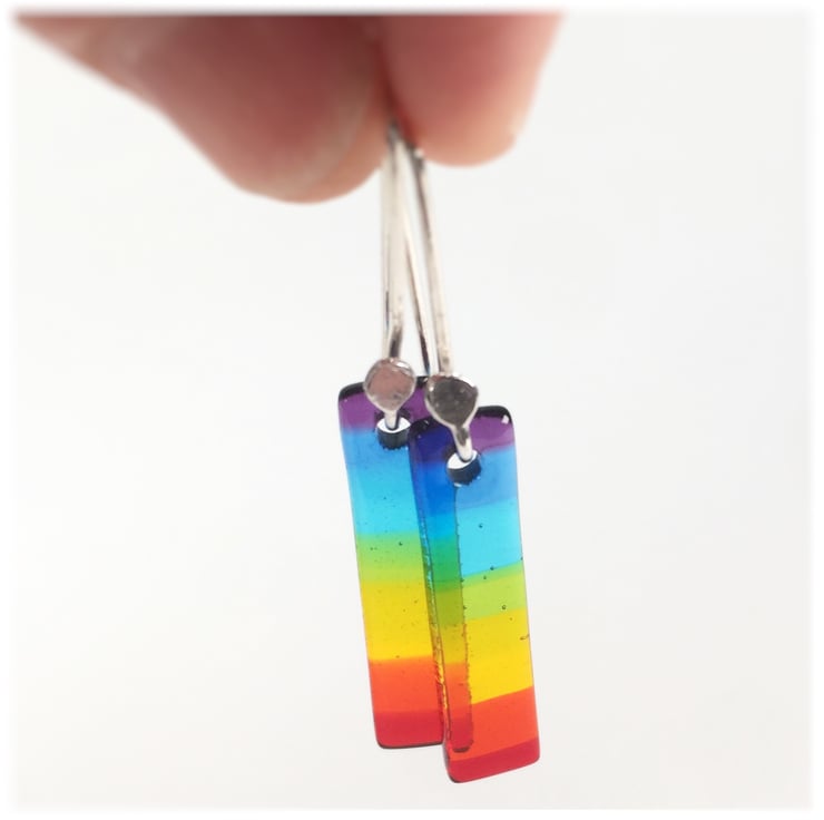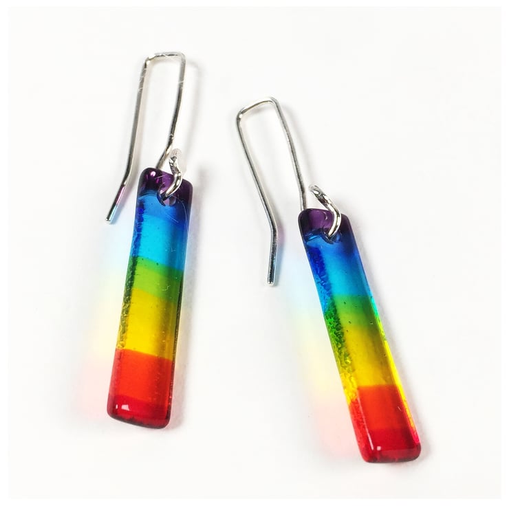 This listing is for a pair of fused glass rainbow earrings on sterling silver ear hooks. Both the glass and sterling silver hooks have been made by myself.