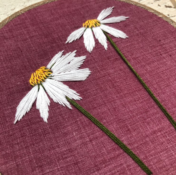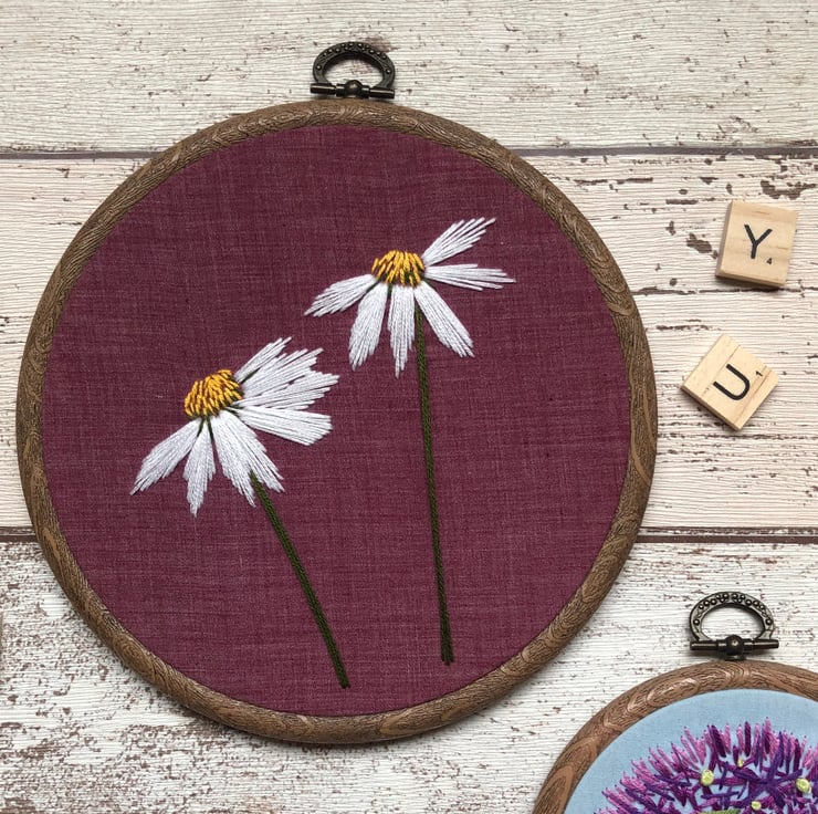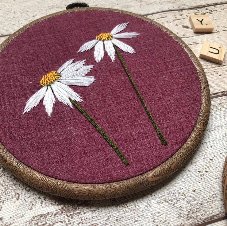 The daisies have been framed in an 6" wood effect hoop, adding to the natural theme of the piece. It has been backed in felt which finishes it off neatly and protects the stitching.