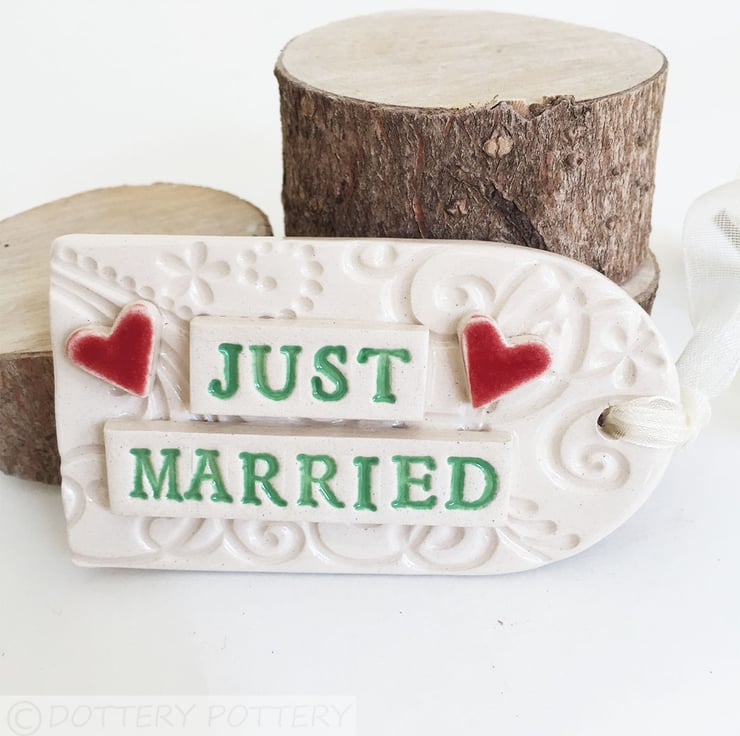 This tag decoration is made from white earthenware clay and is finished two little red hearts.