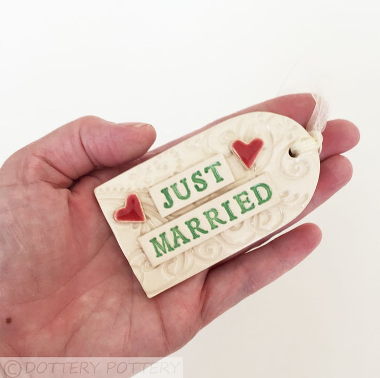 It has been fired twice in the pottery kiln and finished with a clear, glossy glaze for a lovely smooth finish. It measures 9cm x 5cm and hangs from a matching organza ribbon.