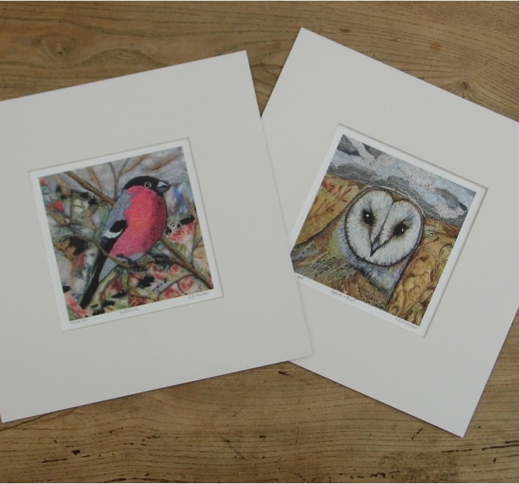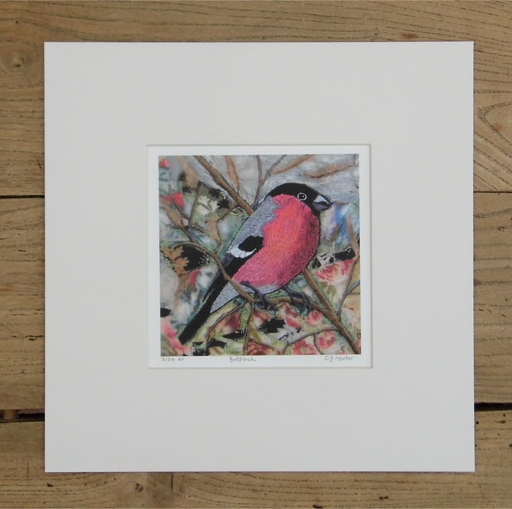 A detailed print of my original embroidery collage of the handsome blushing Bullfinch. Printed on textured fresco soft white card which brings out the raised quality and texture of the original image. Mounted with acid free off-white mount card.